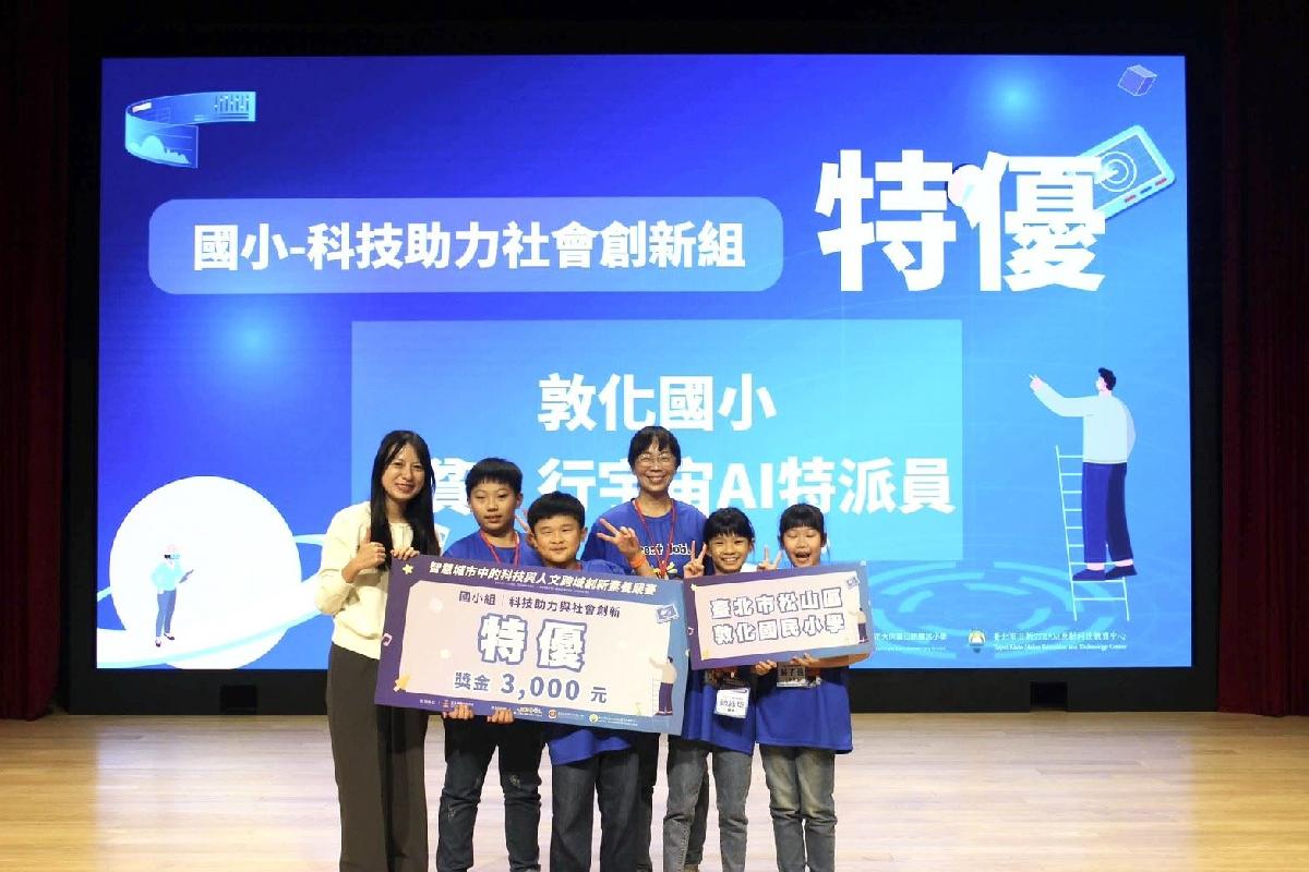 國小組方面,敦化國小「貧行宇宙AI特派員」以「AI暖光計畫」榮獲「科技助力社會創新組」特優,運用生成式AI設計街頭生存遊戲,帶領玩家換位思考無家者處境;學生並走出教室實地訪談,展現公民關懷與行動力,透過科技與數據為弱勢發聲。指導老師廖珮伃表示,過程中可明顯看見學生在人文關懷與同理心上的成長。
