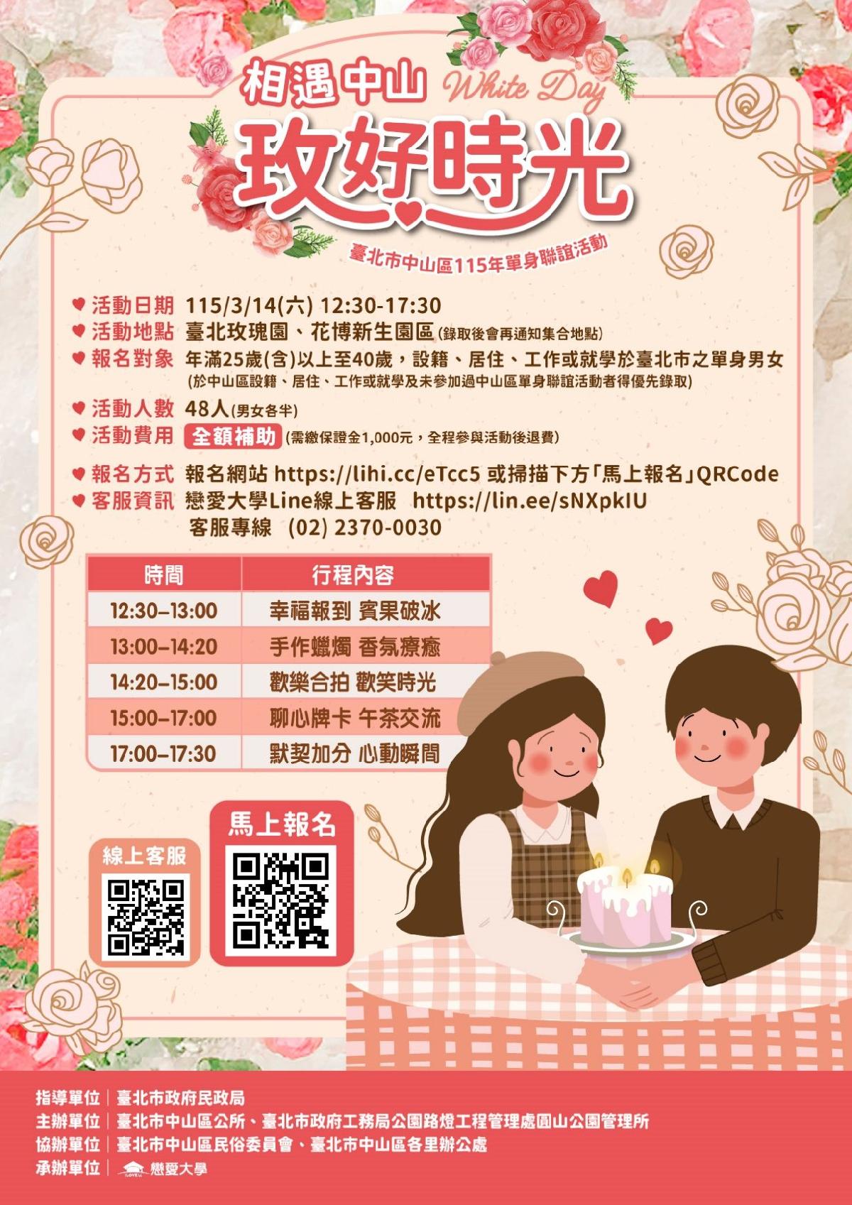 公園處圓山所補充,臺北市中山區公所也將攜手「2026臺北玫瑰展」於3月14日白色情人節打造一場質感與溫度兼具的「相遇中山 玫好時光」單身聯誼活動。除了安排浪漫的賞花漫遊,更精心設計了「團體趣味合拍」與「手作療癒乾燥花蠟燭」等互動環節。透過玫瑰香氛與趣味任務,不僅呼應了臺北玫瑰展的獨特魅力,更在輕鬆自在的氛圍下,為單身朋友搭建起情感連結的橋樑,具體落實臺北市友善婚育與人口政策的願景。