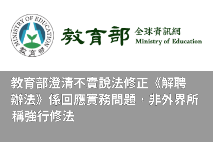 針對近日教團對教育部修正《高級中等以下學校教師解聘不續聘停聘或資遣辦法》及《公立高級中等以下學校教師成績考核辦法》提出質疑,並指稱修法為「強行修法」、「未解決濫訴與小案大辦」、「擴大外聘調查」、「使校園司法化」等,教育部嚴正澄清,相關說法與修法事實及制度內容多有不符,本次修法研修過程納入教師工會及教師團體意見,相關建議已具體反映於制度設計中,包括強化受理與分流機制、不受理匿名檢舉,並明定教師於教師評審委員會或考核委員會陳述意見時,學校應主動提供調查及輔導資料,以保障知情權等;教育部尊重各界表達意見的權利,亦將持續蒐集實務回饋、滾動檢討制度。惟對於與修法事實不符之指稱,教育部有責任即時澄清。