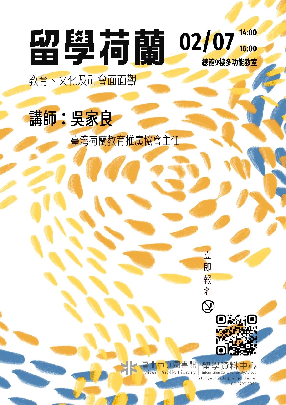 臺北市立圖書館總館留學資料中心於2月7日(六)下午2時邀請臺灣荷蘭教育推廣協會吳家良主任實際說明留學申請流程、時程規劃與注意事項,讓有意赴荷蘭深造的學生對整體準備方向有清楚掌握。無論你正處於資訊蒐集階段,或已開始規劃申請,這場講座都將提供實用且完整的第一手資訊,協助你一步步實踐荷蘭留學的夢想。
