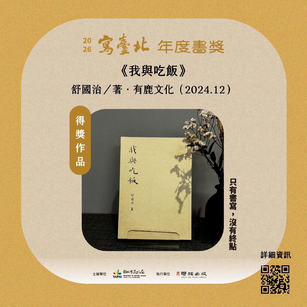 文化局表示,「寫臺北」年度書獎自徵件以來備受出版界與讀者關注,入選作品橫跨文學、藝術、文化觀察、城市歷史等領域,充分展現臺北的多重面貌。經過初審、複審與決審層層評選後,《我與吃飯》在風格、深度與城市連結性上皆獲評審一致肯定,最終獲得年度大獎。後續將推出更多相關活動,包括得主講座及專訪,邀請市民透過閱讀重新看見臺北。