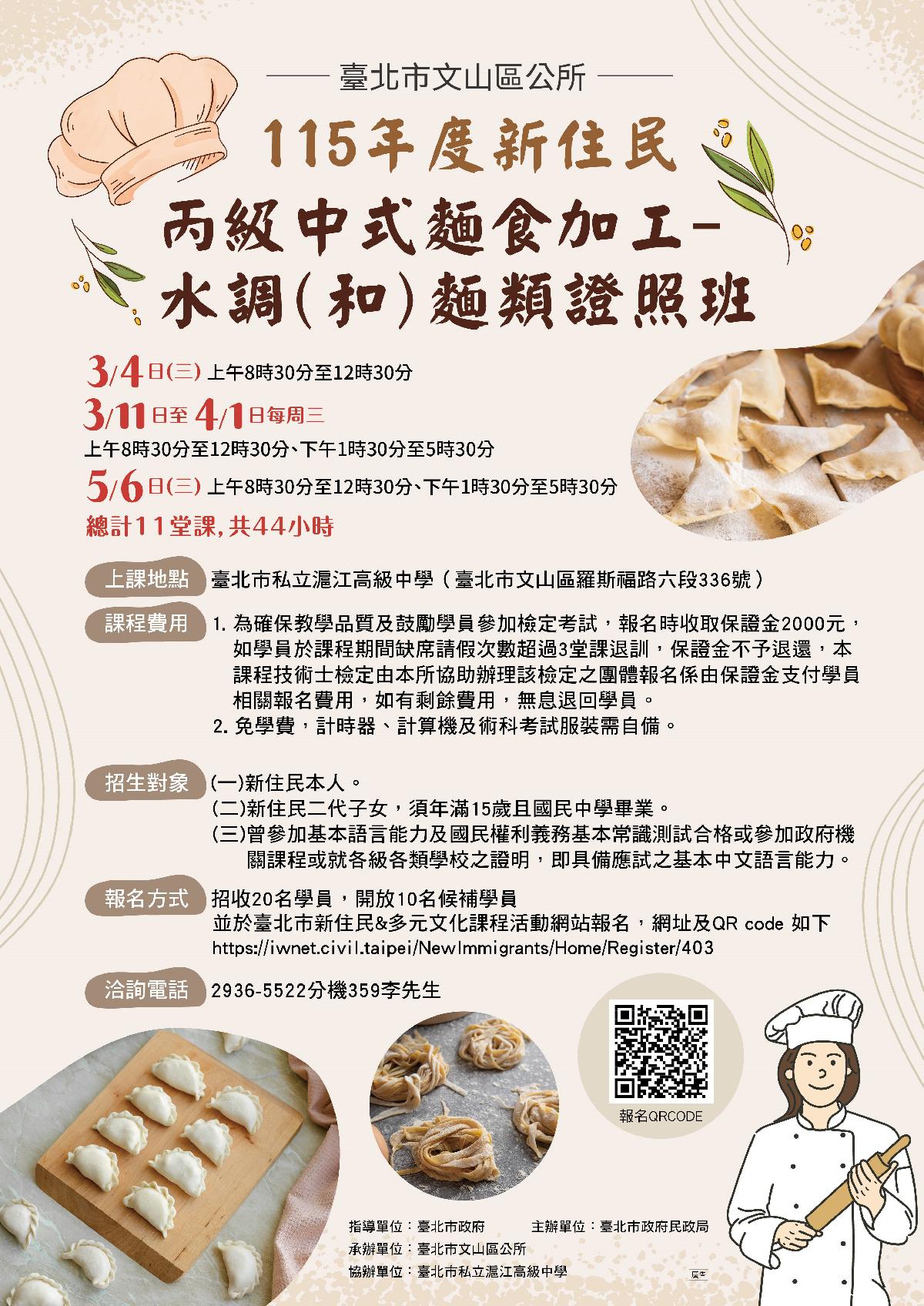 為輔導與培力新住民融入社會,增加產業競爭力及創業能力,文山區公所與臺北市私立滬江高級中學合作舉辦115年度新住民「丙級中式麵食加工-水調(和)麵類證照班」免費課程,課程時間為115年3月4日至4月1日及5月6日,每週三上午8時30分至下午5時30分,11堂課共44小時,藉由專業的輔導機制,協助新住民考取丙級技術士證照。
