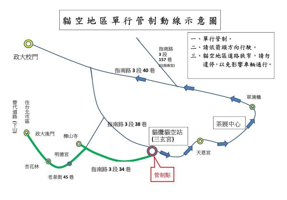 貓空地區:針對貓空山區路幅狹窄及車位稀少問題,警方呼籲民眾多利用大眾運輸工具及貓空纜車。春節連假期間將實施以下管制措施: