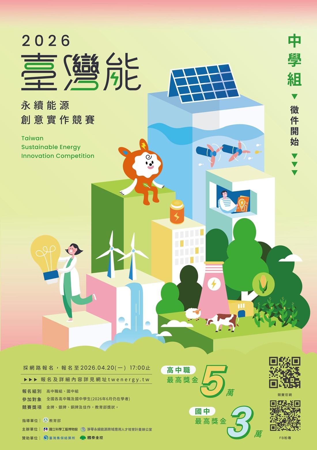 「臺灣能-永續能源創意實作競賽」邀請全國大專、高中職及國中學生以再生及前瞻能源、儲能、能源有效化利用、綠能循環經濟、節能等與「能源科技」相關為主題,以國內外能源應用發展情況或產業需求進行發想。