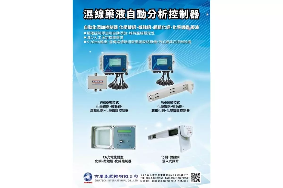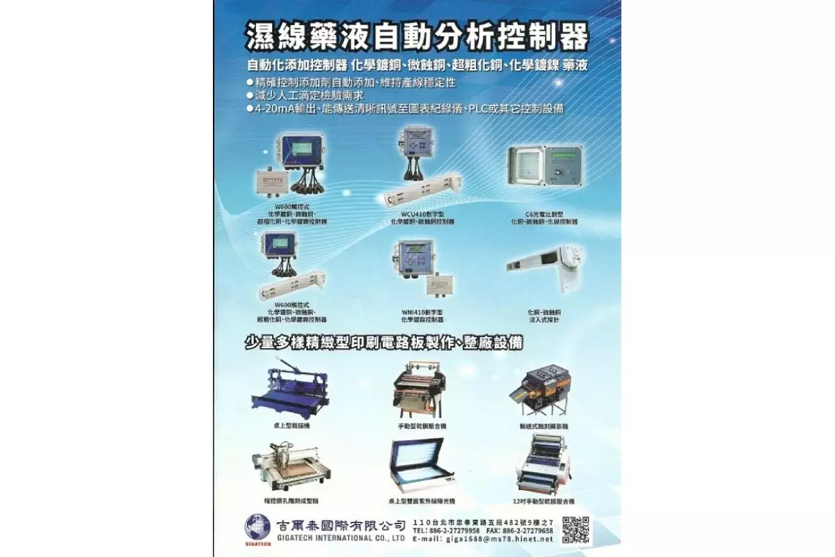 關鍵字組:生產控制系統,軟硬結合板,各類酸鹼藥液再生補充系統,化學銅微蝕控制器,化學鎳控制器,化學鍍錫測厚儀,酸性蝕銅控制器,PCB電路板濕製程產線,自動添加,裁板機,乾膜壓合機,蝕刻機,自動分析,表面處理,程控鑽孔成型機,電鍍槽線,電導率控制器,電路板制作,桌上型裁板機
