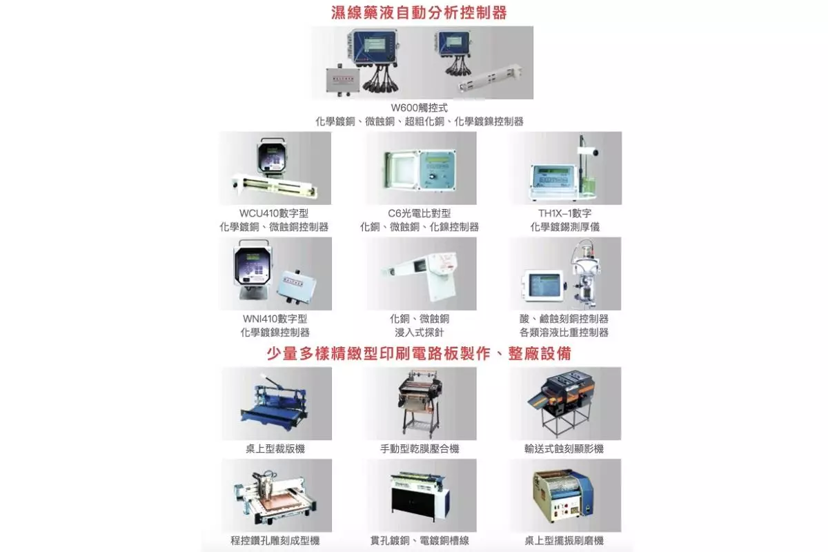 生產控制系統、軟硬結合板、各類酸鹼藥液再生補充系統、化學銅微蝕控制器、化學鎳控制器、化學鍍錫測厚儀、酸性蝕銅控制器、PCB電路板濕製程產線、自動添加、裁板機、乾膜壓合機、蝕刻機、自動分析、表面處理、程控鑽孔成型機、電鍍槽線、電導率控制器、電路板制作、桌上型裁板機