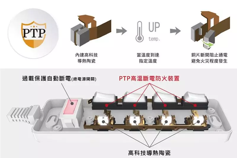 如有長時間使用高瓦數電器的需求,建議選擇搭載「PTP高溫斷電裝置」的安全延長線。此為全球首創、具備專利認證與多項發明獎項的延長線安全設計,能即時偵測插座通電時的內部溫度,一旦超過140°C即自動斷電,有效防止延長線過熱所衍生的用電危險。