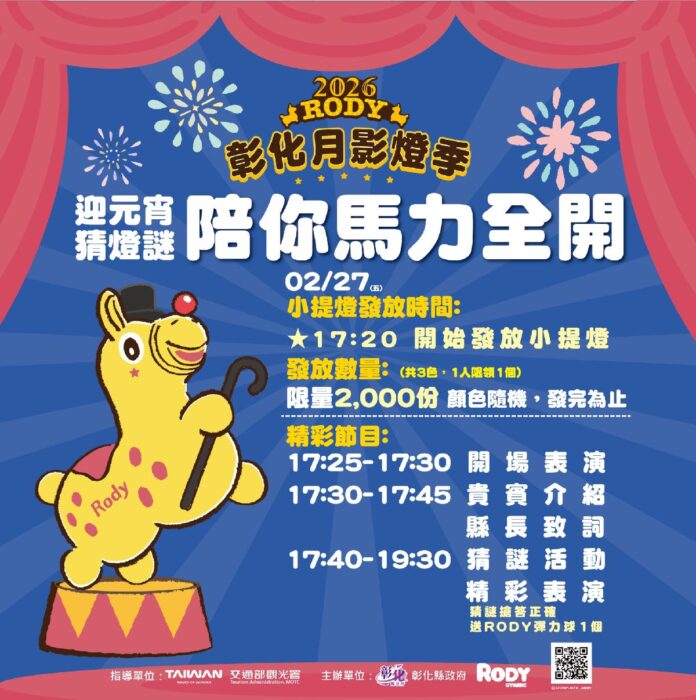 元宵節即將到來,「2026月影燈季」進入展期最後倒數,彰化縣政府將於2月27日(星期五)在八卦山大佛前廣場舉辦壓軸活動「元宵猜謎 馬力全開」。彰化縣長王惠美邀請全國鄉親把握228連續假期,安排彰化小旅行,白天看花、晚上賞燈,串聯各活動場域,輕鬆規劃充實又精彩的連假行程。
