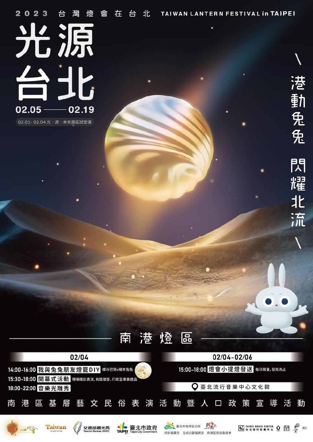 2月4日是南港燈區開幕式,自當天下午3至6點現場除了發放兔年小提燈以外並設有行政宣導攤位,還有蝶谷巴特燈籠親子DIY(採事先報名),當晚開幕式另有精彩表演與有獎徵答,歡迎大小朋友一同走進南港新地標、感受南港區的光雕投影燈會。活動詳情請上南港區公所網站或洽2783-1343轉分機854。