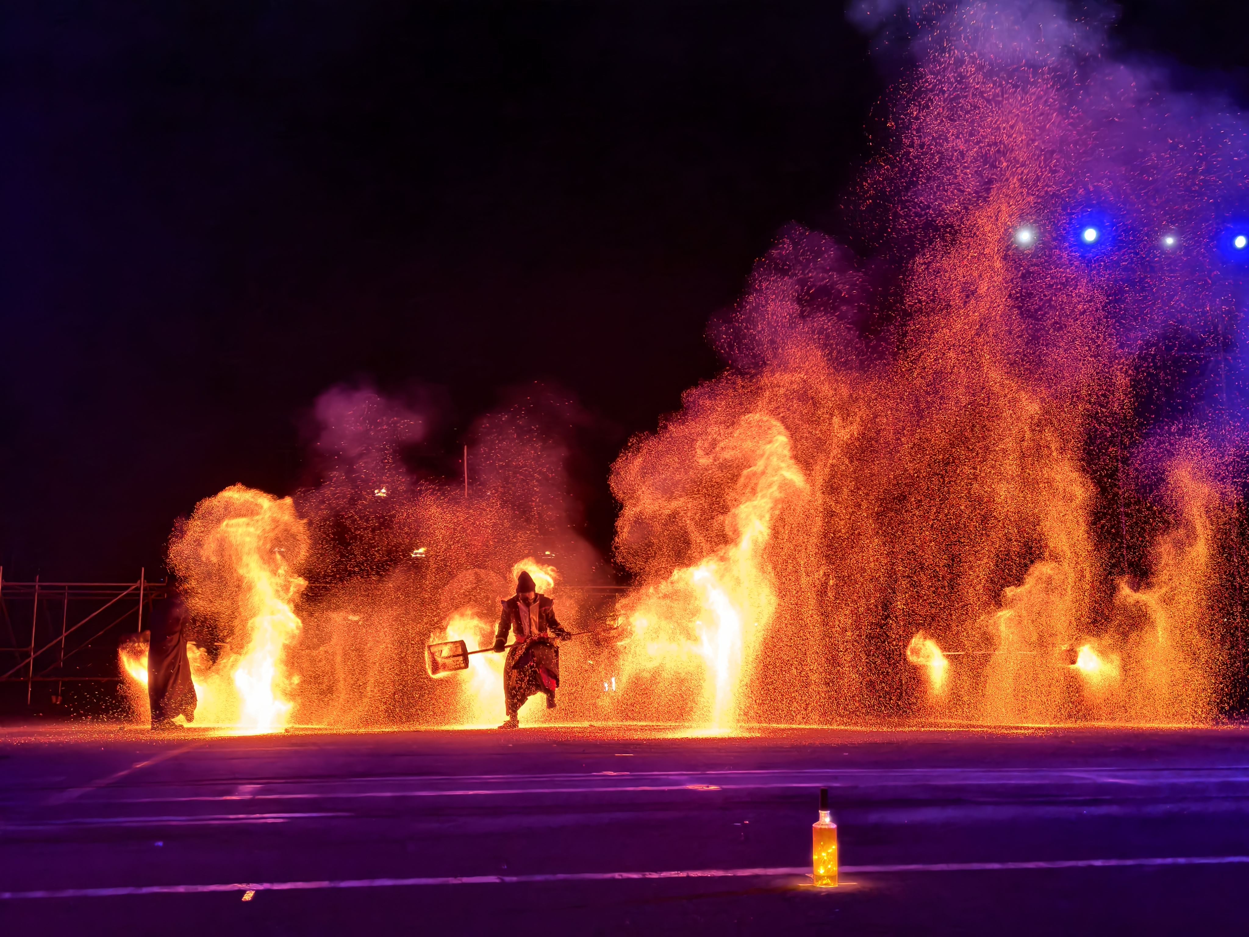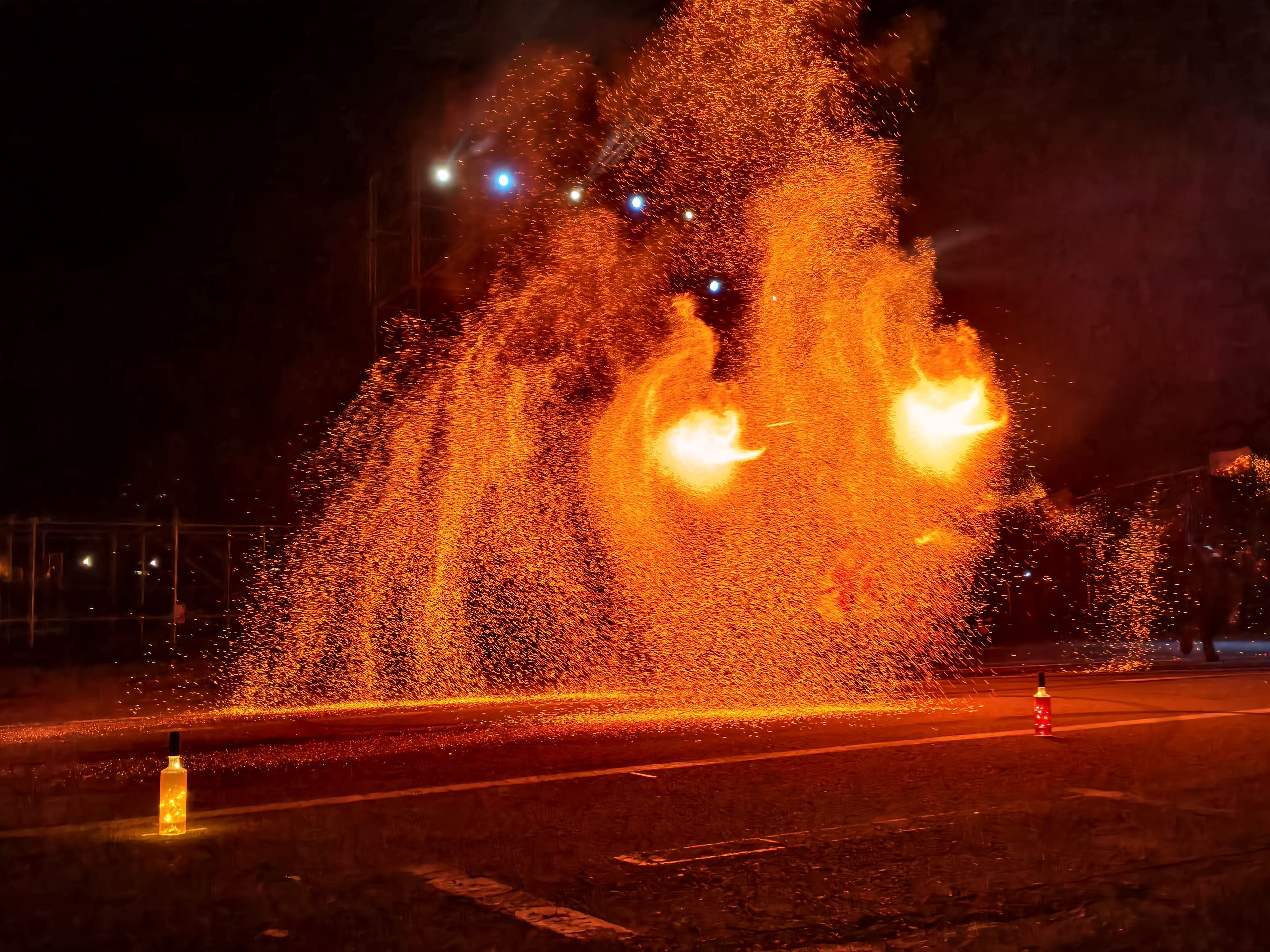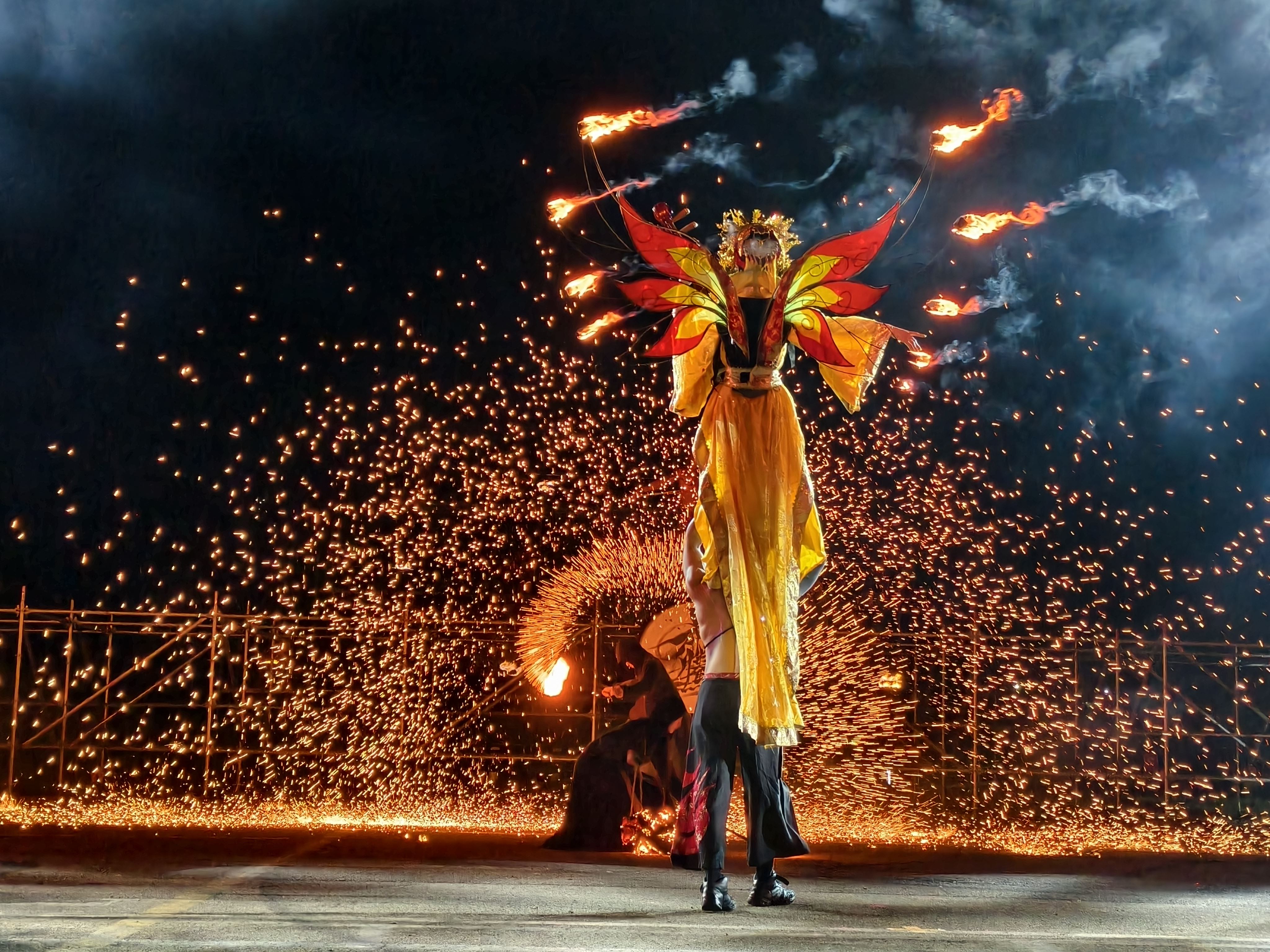 同時,苗栗市公所更跨海邀請來自山西、擁有千年歷史的國家級非物質文化遺產技藝—「打鐵花」藝術團隊蒞臨展演。匠師將1600度高溫熔鐵擊向夜空,鐵花瞬間綻放如金色星雨傾瀉而下,氣勢磅礡、燦若煙火,被譽為「最原始也最壯麗的民間煙火藝術」。打鐵花是中國古代匠師們在鑄造器皿過程中發現的一種民俗文化表演技藝,始於北宋,盛於明清,至今已有千餘年歷史。