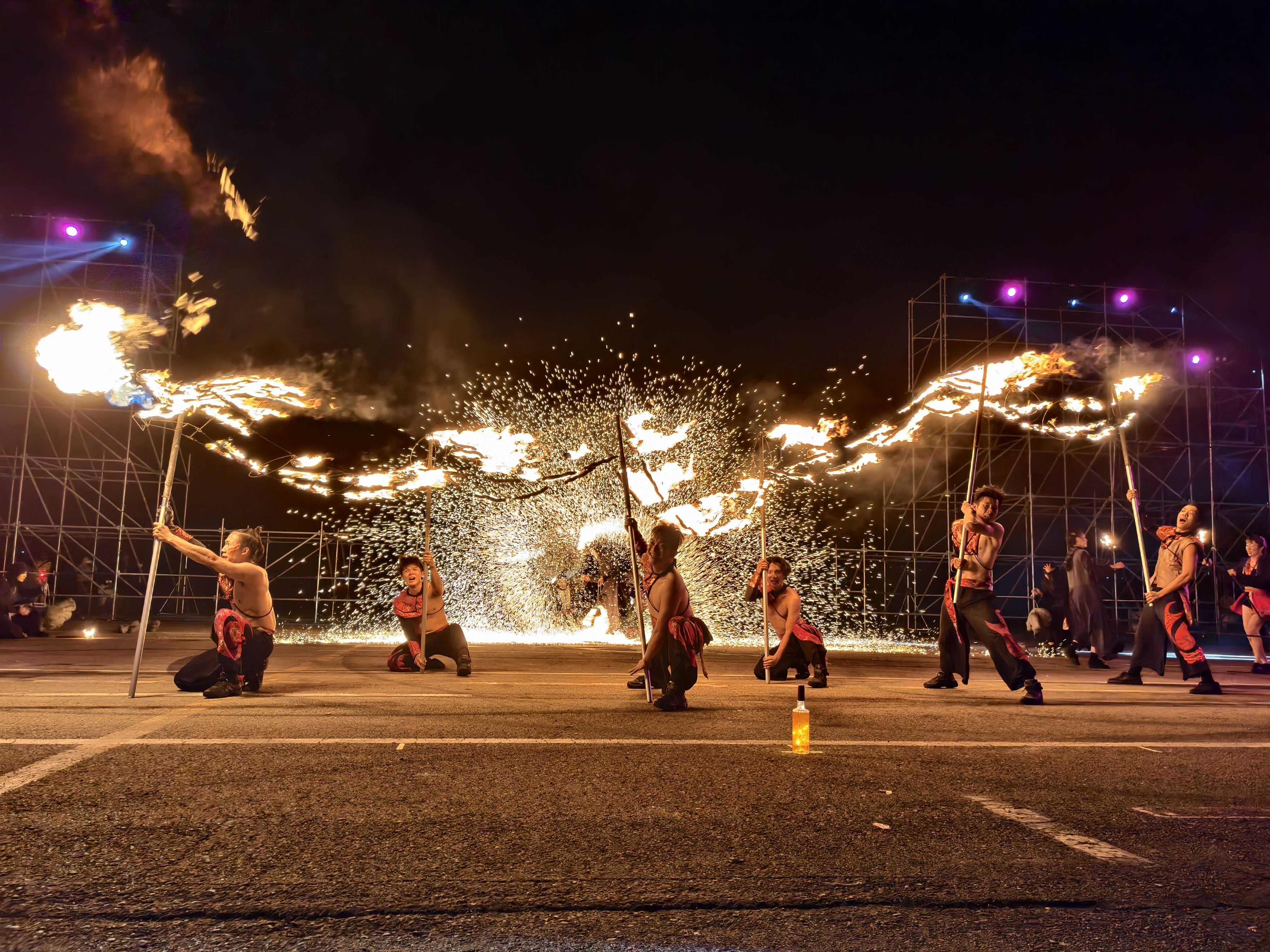系列活動於今晚率先在苗栗市經國路河濱公園震撼登場,以「火」為文化核心意象,打造一場跨越地域與藝術形式的火焰盛典。主舞台特別邀請台灣知名火舞藝術團隊Coming True Fire Group 即將成真火舞團擔綱演出。該團隊以高難度火舞技巧、精準節奏掌控與劇場式編排聞名,結合現代舞蹈、音樂與視覺設計,讓火焰在舞者手中化為流動的藝術語彙,展現力與美交織的震撼場景。