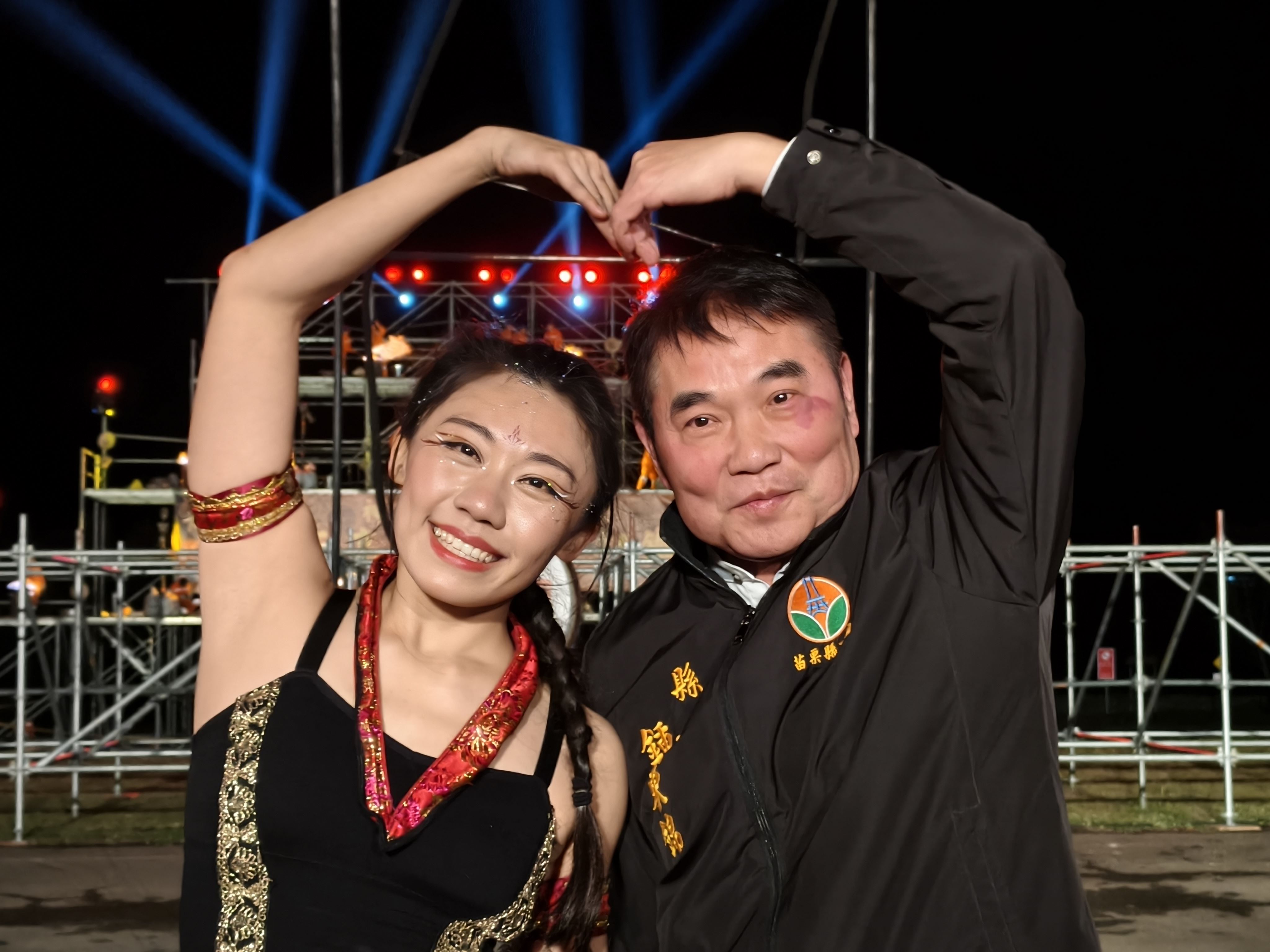 鍾縣長說,剛剛帶來精采演出的即將成真火舞團,是台灣唯一具備完整演職員的演藝團隊,特別為今晚節目安排火巨人、火龍、火裙及火瀑布的演出,讓大家驚豔震撼,壓軸的是大家曾在陸劇中看過,擁有千年歷史的山西的打鐵花,今天可以親眼目睹,相當難得,此外,公所也精心安排優樂合唱團、社區廣場舞表演及市集等,歡迎大家來苗栗歡慶元宵。
