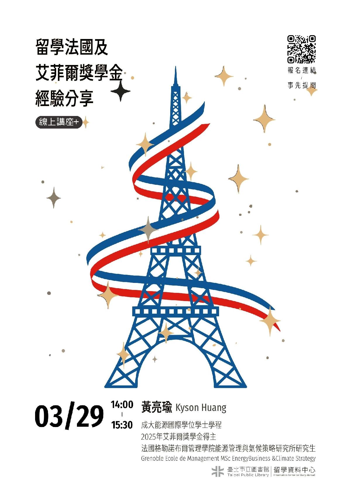 臺北市立圖書館留學資料中心3月29日(日)下午2時法國留學講座,邀請黃亮瑜講師簡介法國高等教育體系與實際留學經驗,說明從選校、準備資料到遞交申請的流程,並分享過程中需要特別留意的細節。後續將介紹「法國艾菲爾獎學金」,說明其申請資格、補助內容與申請流程,協助同學了解如何善用獎學金資源,減輕留學期間的經濟壓力。