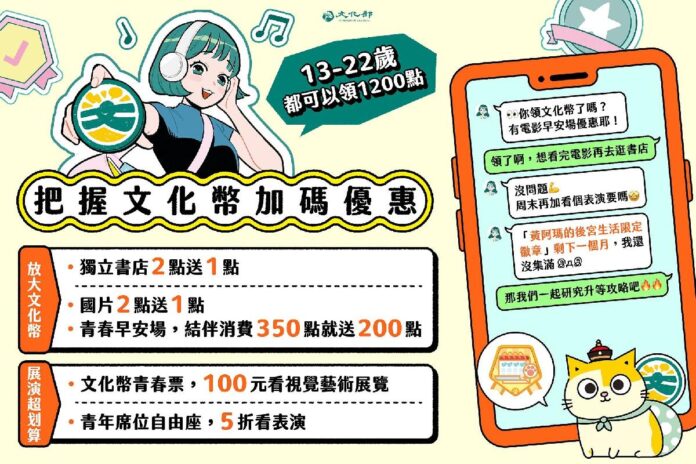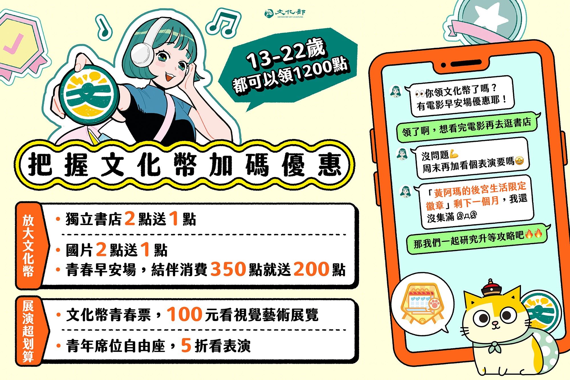 今(2026)年文化幣全面發給13至22歲青少年每人1200點,寒假及9天農曆假期過後,已有超過116萬人領取,領取率達57%,使用金額突破6.2億元。隨著新學期展開,文化部鼓勵青少年利用文化幣轉換心情,走進書店、展覽館、劇場等,尤其鼓勵配合文化幣APP遊戲任務第1季的國片主題,以及利用3月底前期間限定的國片全時段2點送1點、結伴350點送100點、早場350點再送100點的超值優惠,一起進入熱映國片劇情裡的笑與淚。