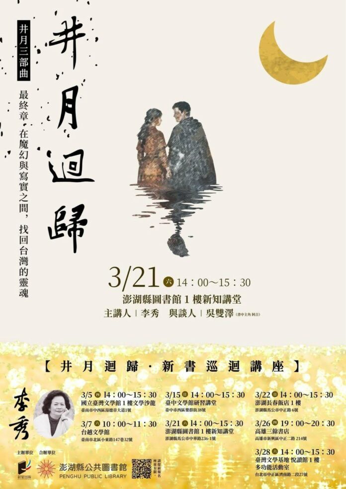講座將從《井月澎湖》動盪時代下的家族命運、《井月流轉》離開母土後的漂流視角,走向《井月迴歸》百年航行的歸返。透過創作分享,探討文學如何作為記憶的容器,承載島嶼的人情、時代脈動,以及台灣母語書寫的價值。