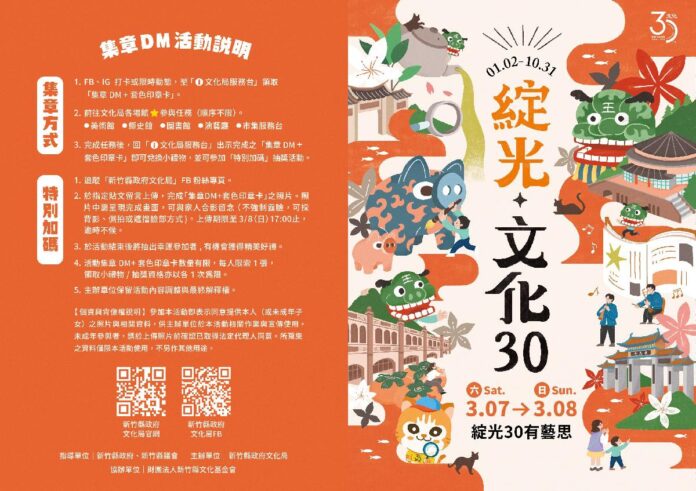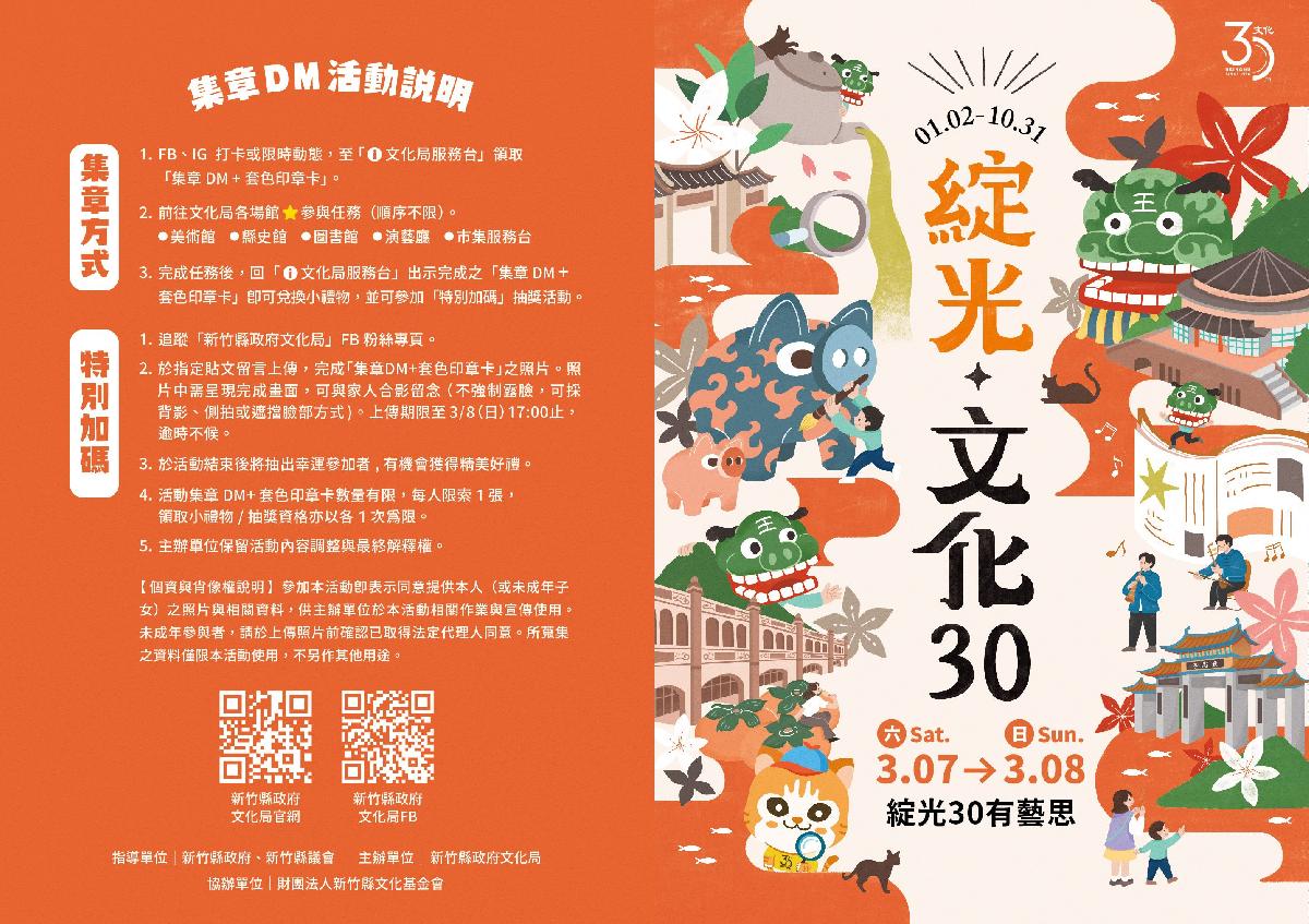 為慶祝新竹縣政府文化局成立30週年,文化局特別規劃一系列局慶活動,即將在3月4日登場的「綻光30」藝文人士餐敘,邀請在地客家主廚精心設計的特色料理餐盒及多元藝文表演,款待來自各界藝文人士;3月7日起一連兩天還有「綻光30有藝思」局慶系列活動於文化局園區登場,規劃多元創意導覽體驗、趣味集章闖關,並設置文創市集、手作體驗及街頭藝人演出,邀請民眾一同共襄盛舉。