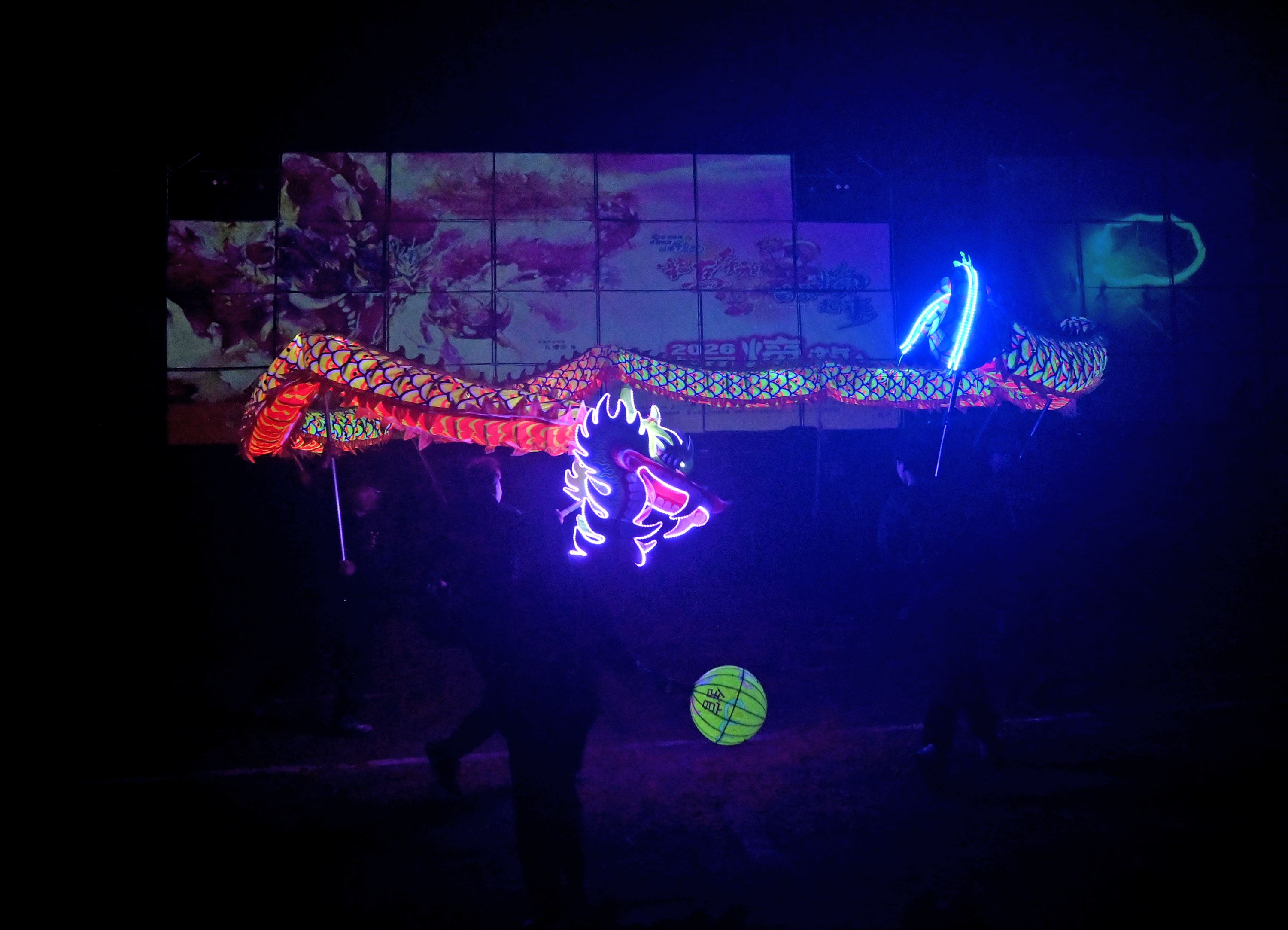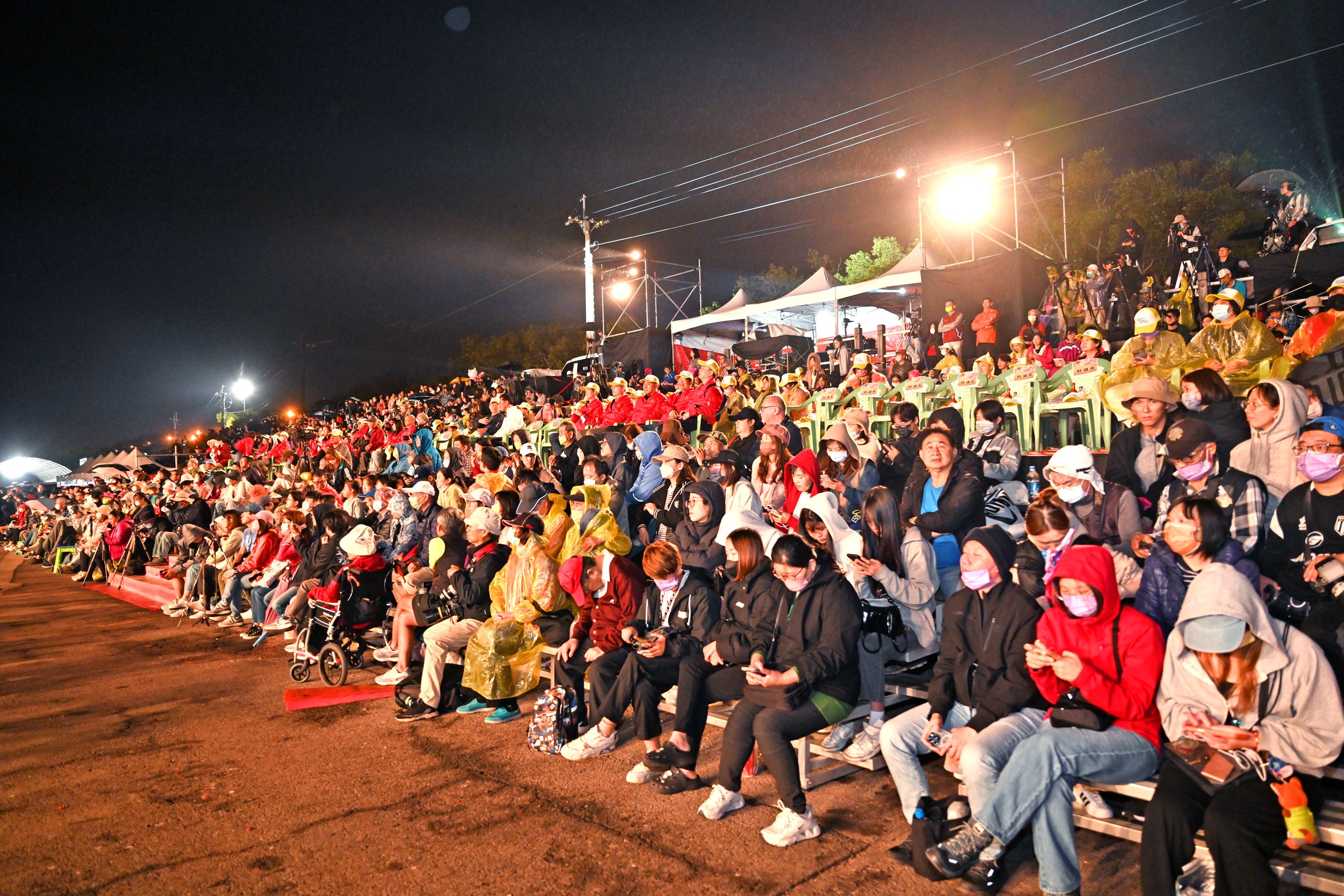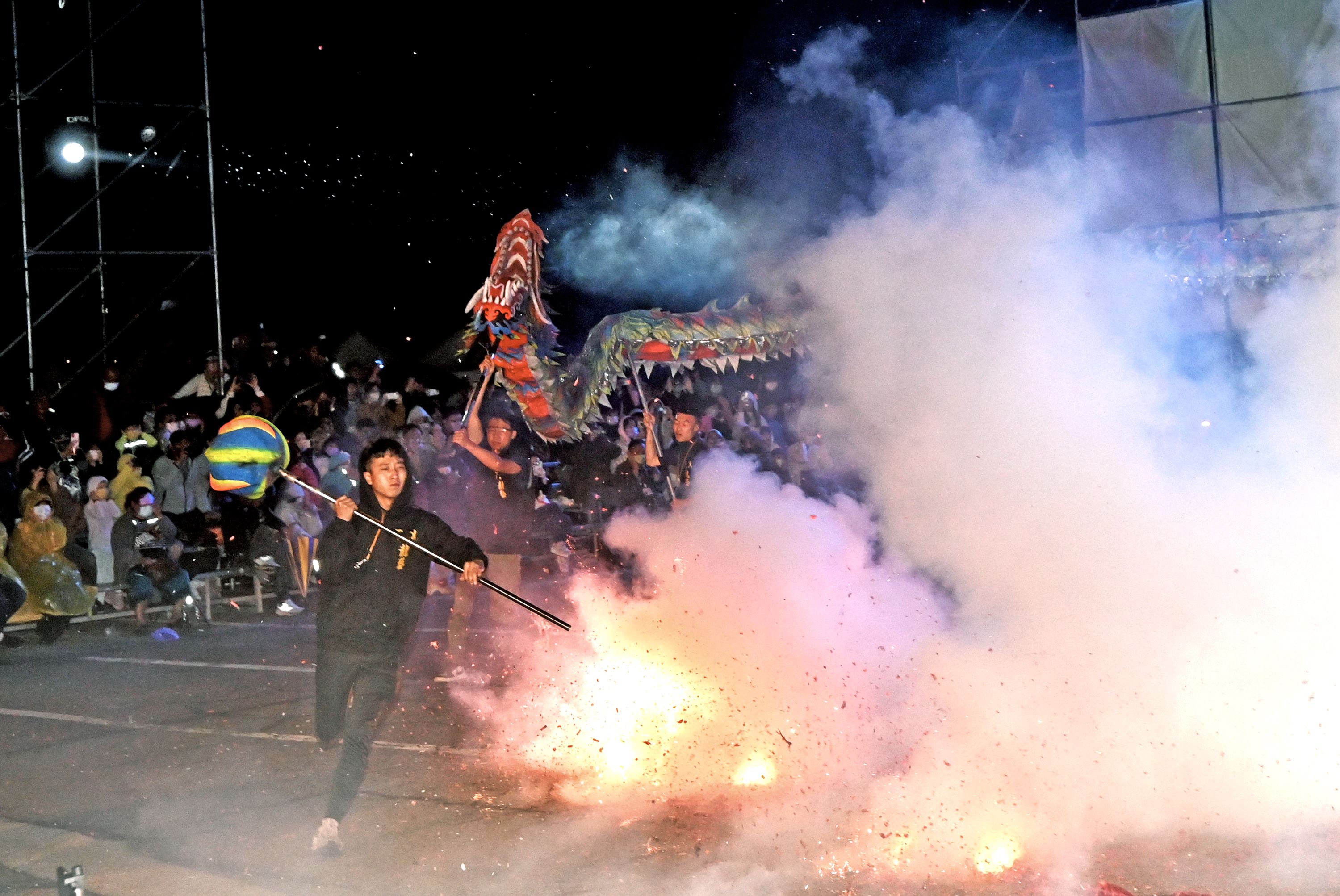 晚間的火旁龍之夜由兩廣阿貴師國術醒獅團開場,參與炸龍的隊伍隨後接續進場。為了讓民眾更具參與感,公所也特別規劃「火旁龍體驗區」,準備手套、耳塞、護目鏡,讓在場的民眾再視覺及聽覺上感受火旁龍的震撼。