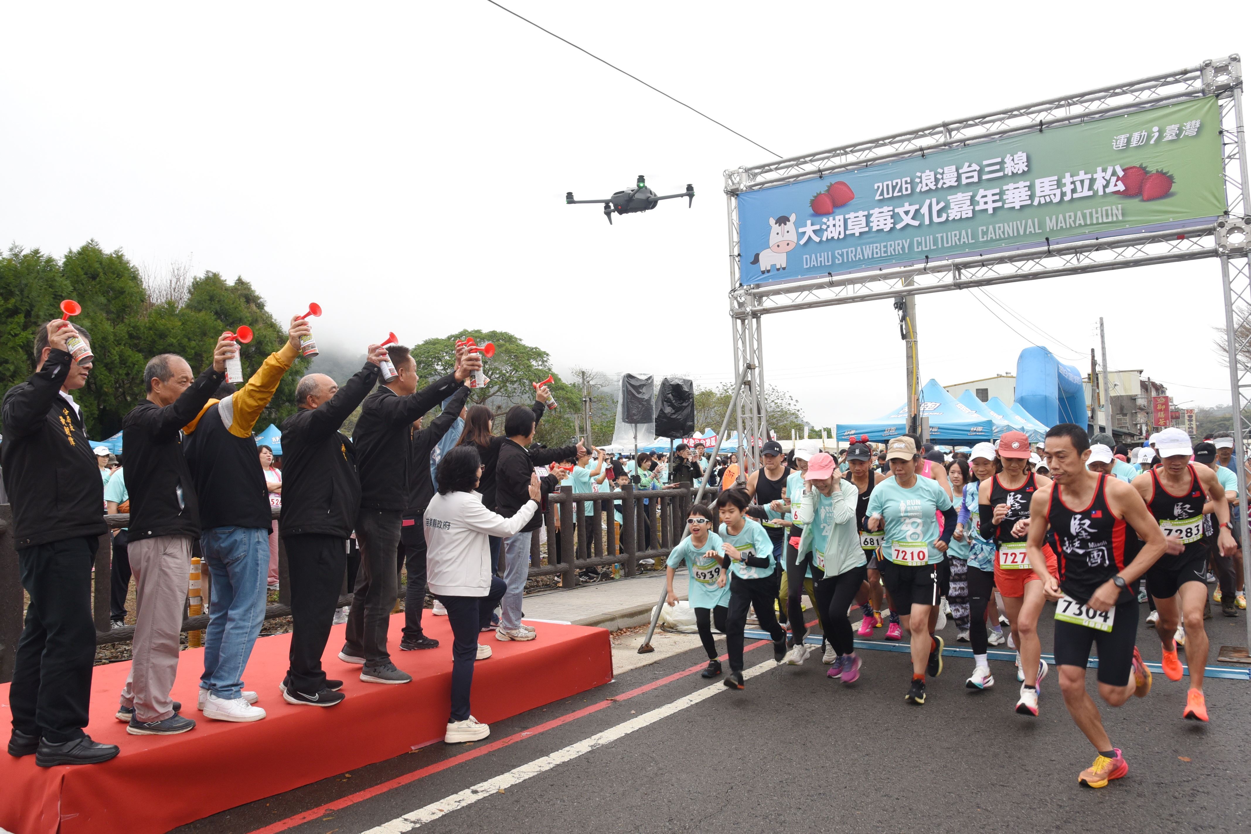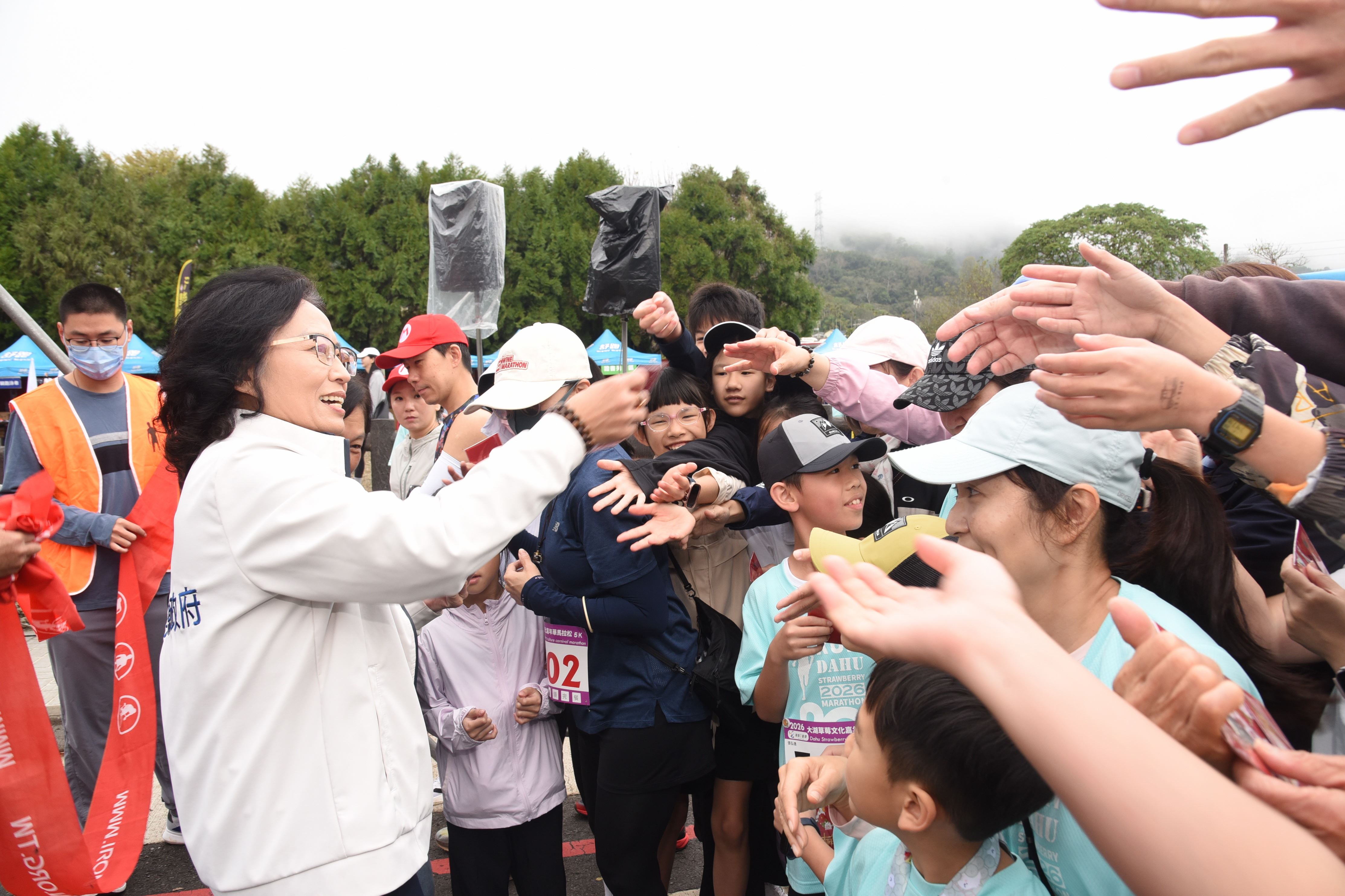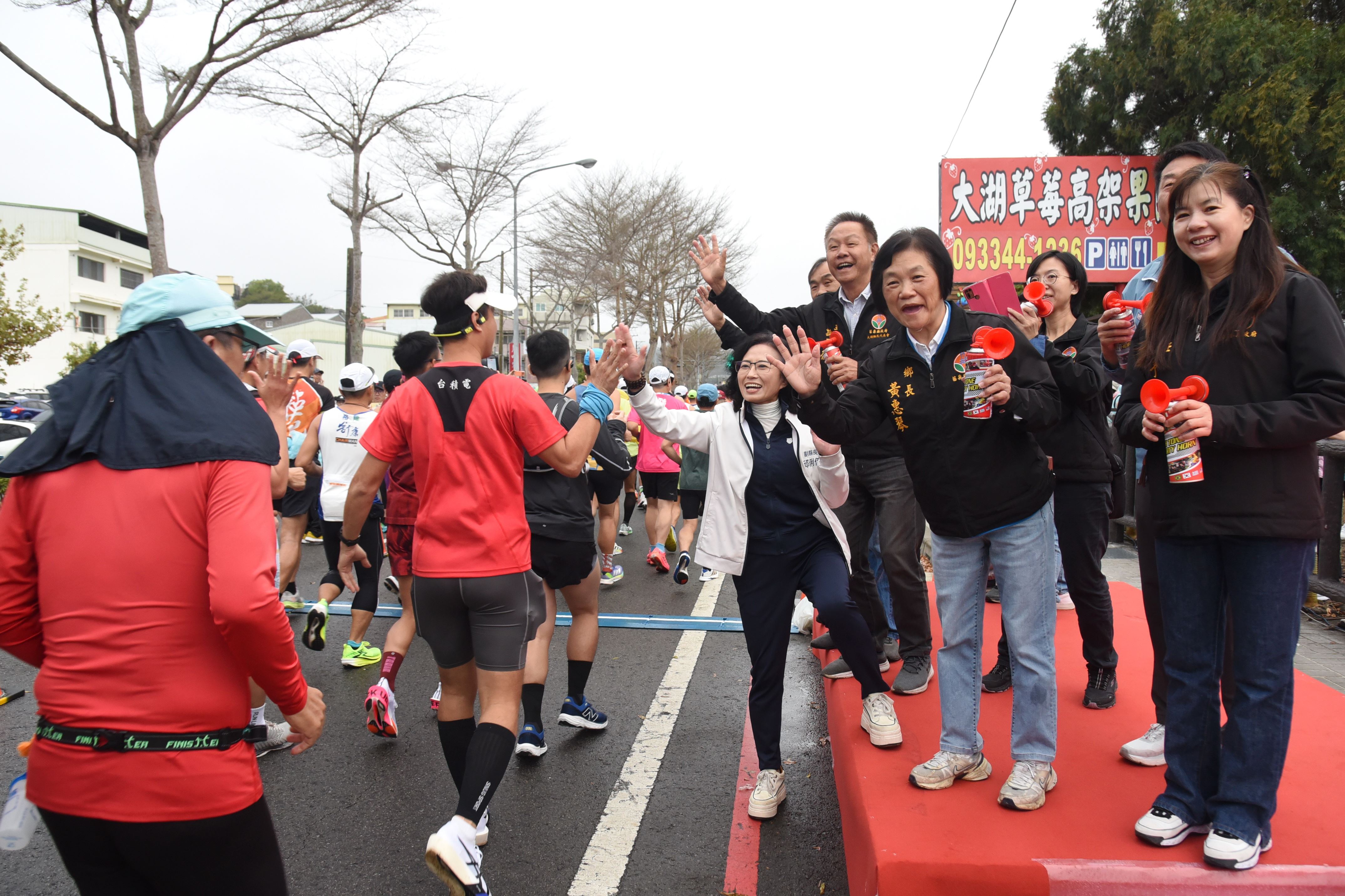 2026戀戀大湖草莓文化嘉年華全國馬拉松,28日清晨在副縣長邱俐俐、大湖鄉長黃惠琴及地區農會三巨頭鳴笛後開跑,3600多名分別參加全馬、半馬、健跑及休閒組的跑者,每間隔20分鐘相繼起跑。邱俐俐到場歡迎來自全台、離島和國外的路跑愛好者,在起跑點與跑者擊掌為他們加油打氣,另加碼致贈相當搶手的縣長馬年福袋和拱天宮奶嘴,給來自遠方的跑者和同行的嬰幼兒。