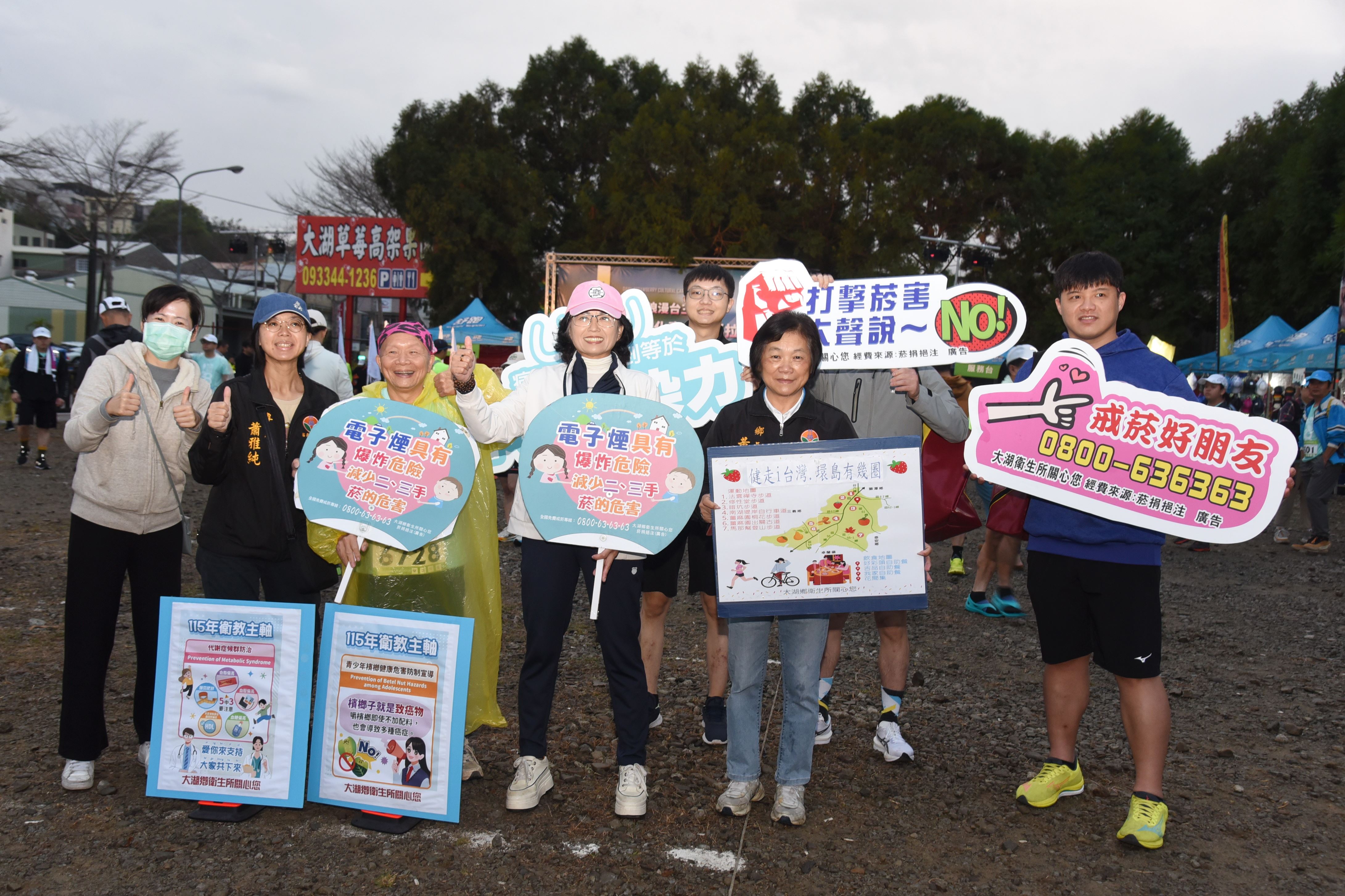今天一早雖是濛濛細雨的天氣,但數千名跑者仍提前在大湖酒莊集合暖身,起跑前雨勢停歇迎來舒爽的天氣。副縣長邱俐俐帶領農業處專員蕭雅純、大湖鄉長黃惠琴、代表會主席謝見德、衛生局主任張予緁、分局長黃朝偉及地區農會理事長傅松琳、常務監事范鼎房、總幹事徐欽志等人,熱情歡迎來自各地的跑者,期許他們馬年「馬力全開」。