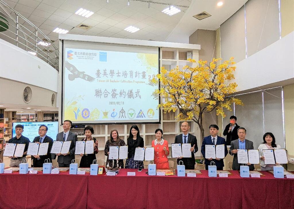 【臺北報導】國際教育及資訊教育為臺北市推動的重要教育政策,本市南湖高中等9校自109年度起,運用臺北市網路學校資源共享的系統,與英國普利茅斯城市學院(CCP)合作,推動「臺英學士培育計畫」,培養高中職學生進入英國教育學制所需的學習及技能。為提供學生更完善、多元的選擇,進一步與英國普利茅斯城市學院合作進階的課程計畫,共同舉辦備忘錄簽約儀式-「臺英學士培育計畫2.0」。