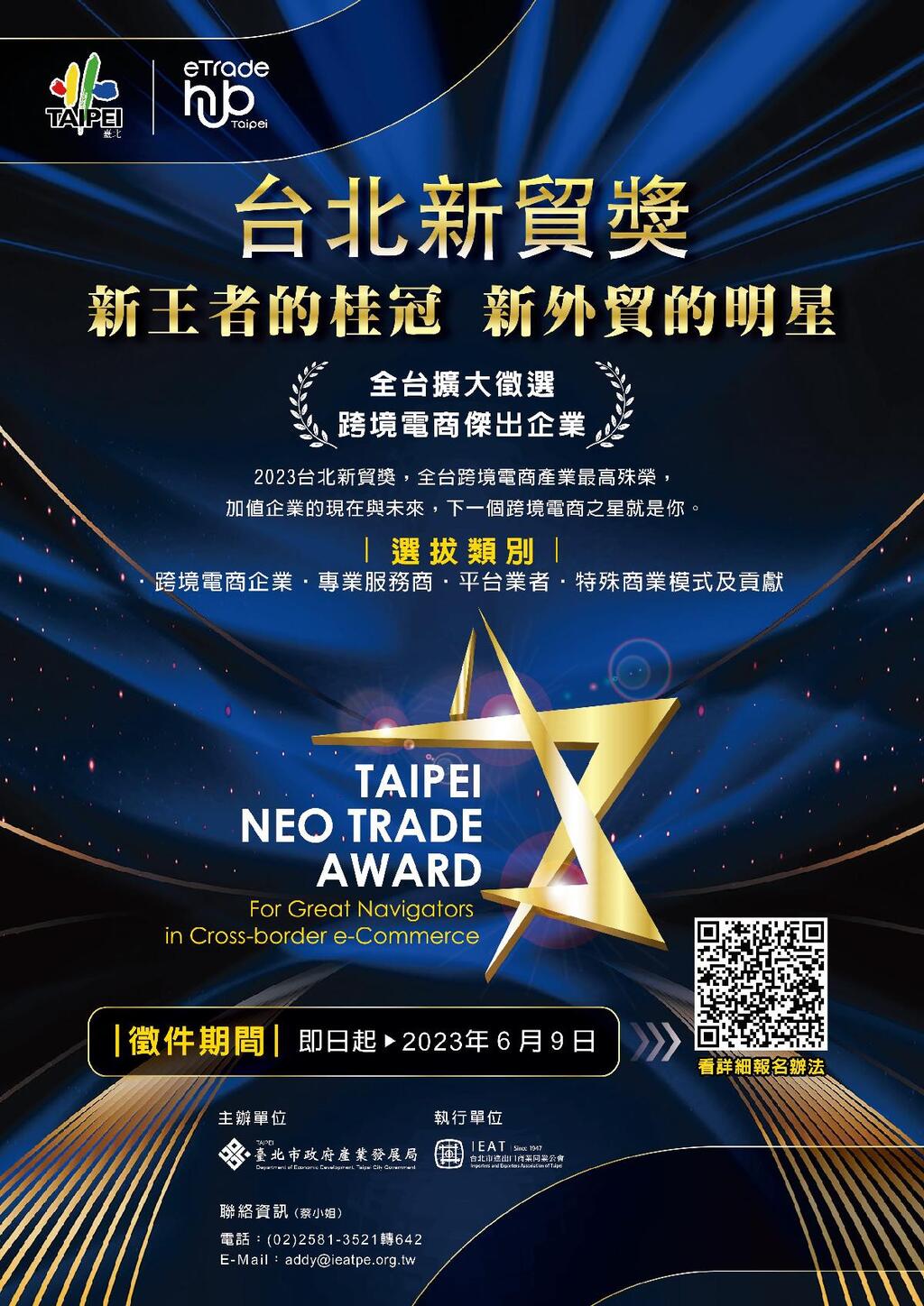 本年度評選結果預計於10月舉辦之「2023台北跨境電商年會」中公開表揚,歷屆得獎者強力推薦,歡迎全台企業踴躍報名參加,更多活動訊息請至「台北新貿獎」官網https://reurl.cc/7RKkDk查詢,或洽02-2581-3521分機642 蔡小姐。