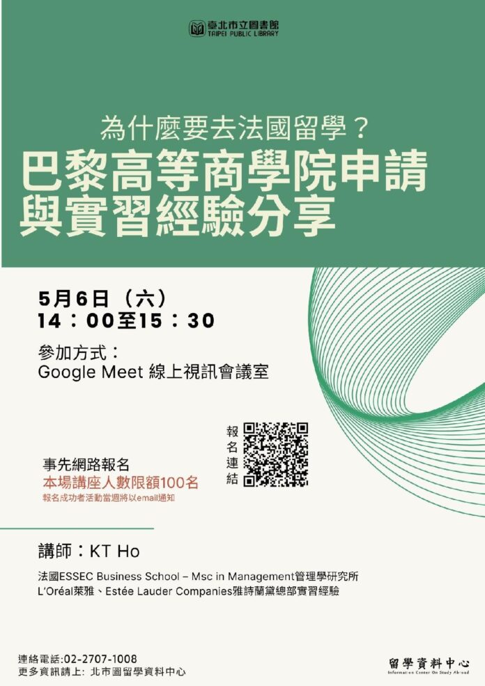 臺北市立圖書館留學資料中心於5月6日(六)14時邀請畢業於法國巴黎ESSEC Business School–Msc in Management(法國高等商學院管理學研究所)KT Ho講師,簡介留法優勢與法國商學院體制,學校申請與文件準備流程,各項檢定、Essay及推薦信撰寫、面試過程,食衣住行生活小訣竅,法國實習、求職管道和技巧經驗分享等資訊。