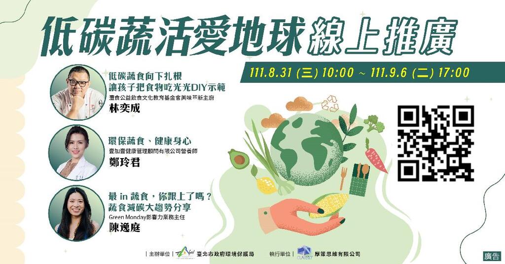 2050淨零排放已成為全球共識,各國積極加速推動各項氣候行動。大至國家政策,小至個人行為改變皆可減碳。臺北市環保局將於8月31日(三)上午10時至9月6日(二)下午5時在臺北市無圍牆環境教育博物館網站推出「低碳蔬活愛地球」線上推廣活動,邀請大家一起來看影片充實環保蔬食知識,擁抱健康的身體與自然環境,以蔬活飲食共同保育地球,降低地球暖化。