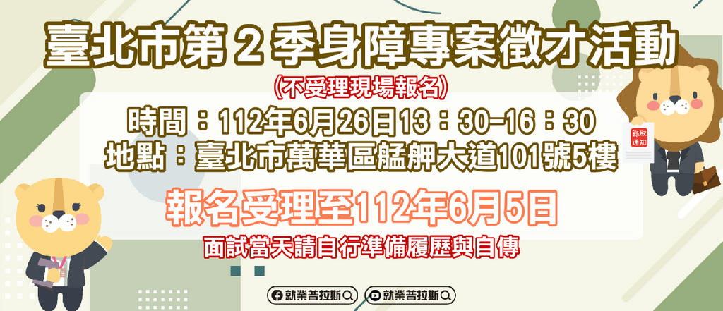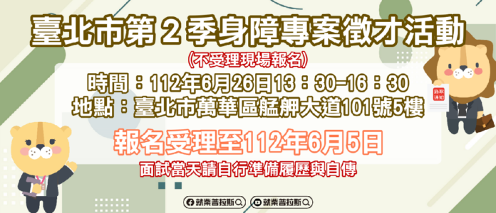 臺北市勞動力重建運用處辦理第2季身心障礙者專案徵才活動,即日起開始報名至112年6月5日!歡迎有求職或轉職需求的身障朋友們踴躍報名,本次活動一律須事先預約報名,還規劃了履歷健檢的研習課程,課程時間為112年6月7日上午9時,期協助報名參加徵才活動的身障朋友能做好面試的準備。