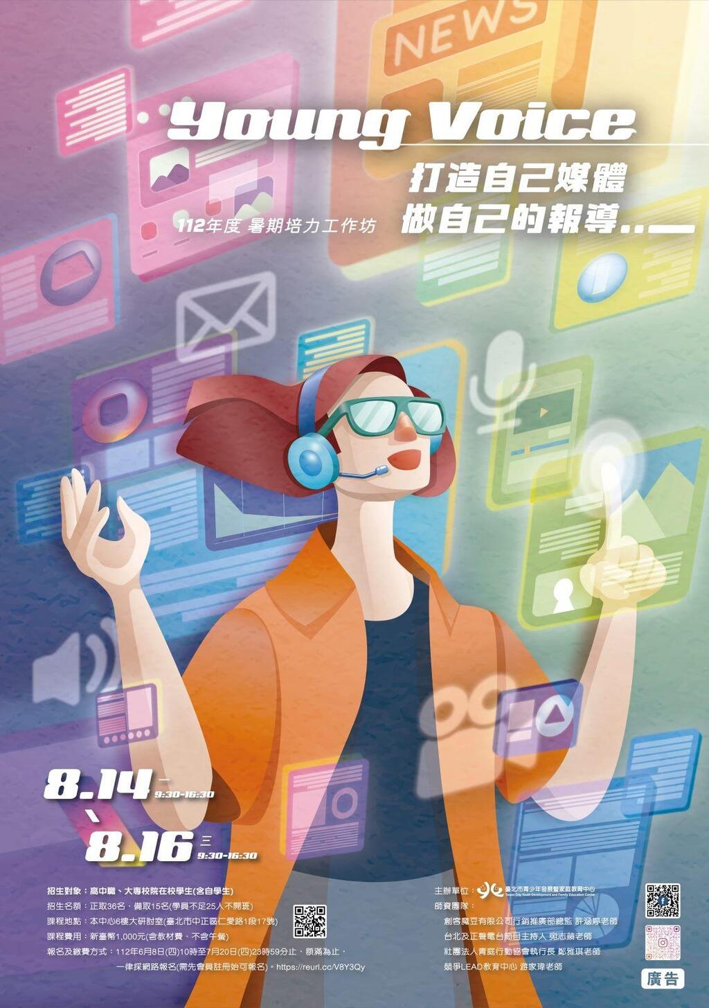 暑假何處去?數位時代的興起,為培養青少年媒體識讀、提高參與公共議題討論意願,並透過認識新興自媒體管道製作影音或圖文的報導,進而接納多元觀點並發展獨立思辨能力,臺北市青少年發展暨家庭教育中心針對青少年最感興趣的多元自媒體寫作及應用能力,於8月14日(一)至8月16日(三)辦理「112年度『Young Voice:打造自己媒體‧做自己的報導』暑期培力工作坊」,三天課程全程參與可獲頒結訓證書,名額有限,歡迎高中職、大專校院在校學生(含自學生)儘速上網報名。