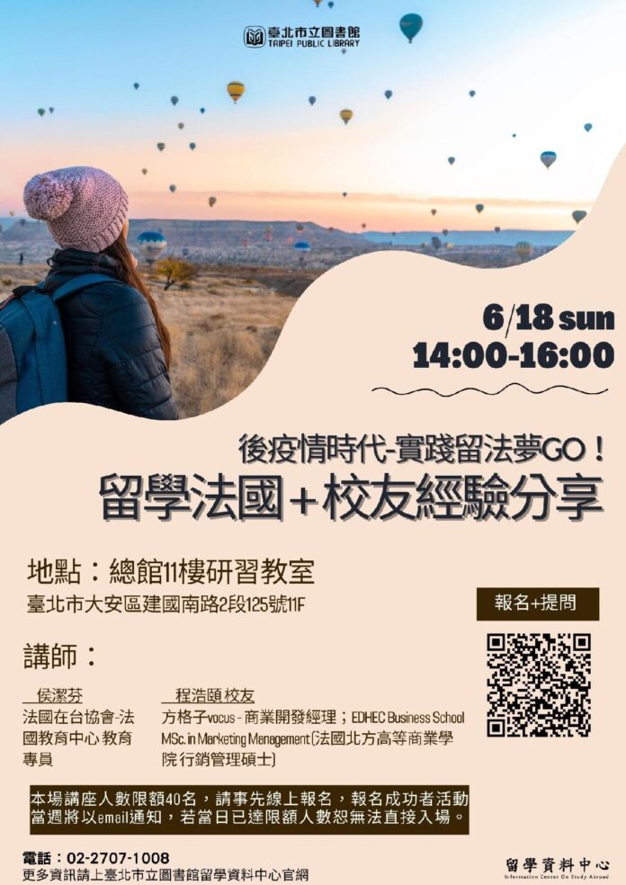 北市圖總館留學資料中心於6月18日(日)14:00邀請法國教育中心侯潔芬教育專員,簡介留學法國的特色,「精英學校」培育未來的商管、理工人才,若您學習法語或是學位課程,法國當地提供合理的費用且優秀的教學品質,且學生在就學期間享有各項優惠福利,以及說明完成法國學業後的發展可能;校友分享由程浩頤講師介紹EDHEC Business School MSc. in Marketing Management (法國北方高等商業學院 行銷管理碩士)學習經驗與簡介課程內容資訊,當地日常生活訣竅,實習經驗以及留學帶給自己的啟發,歡迎有志赴法國的學生和一般大眾報名參加。