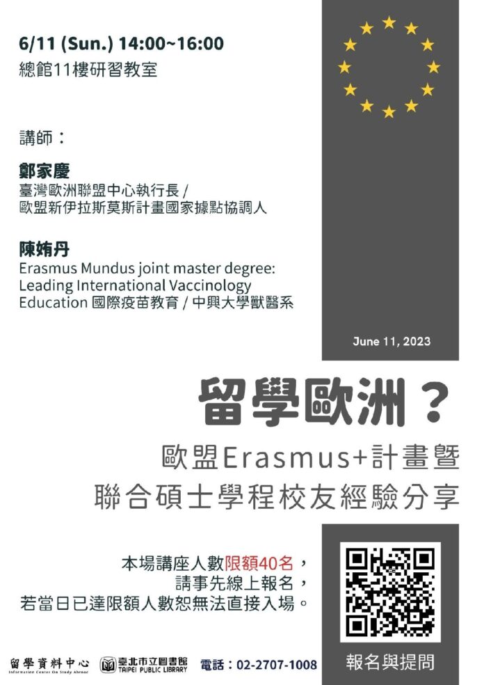 北市圖總館留學資料中心於6月11日(日)14:00邀請臺灣歐洲聯盟中心鄭家慶執行長,分享歐盟ERASMUS+計畫,教育部歐盟獎學金申請資格、歐盟在臺機構資訊簡介等實用資訊;校友分享將由陳姷丹講師,簡介歐盟聯合碩士學程(Erasmus Mundus joint master degree: Leading International Vaccinology Education,國際疫苗教育),為何選擇歐盟學程,學習領域範疇與內容、同時擁有前往歐洲與非洲學習經驗與當地日常生活分享,歡迎有志赴歐盟的學生和一般大眾報名參加。