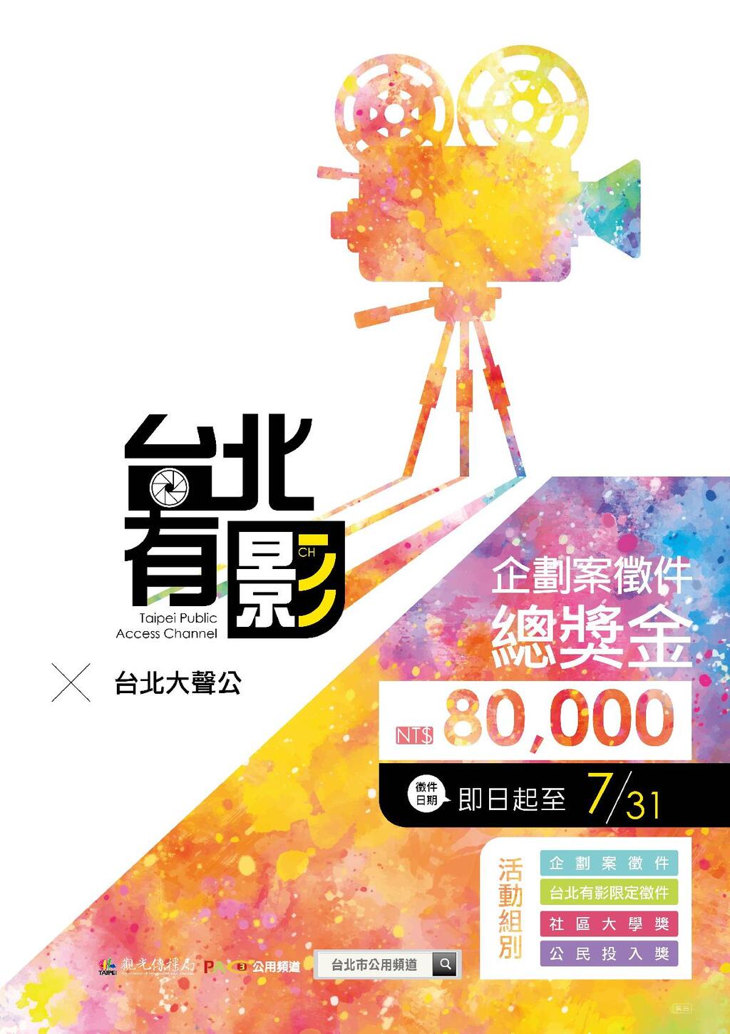 為推廣臺北市有線電視公用頻道(第3頻道)與媒體近用權,臺北市政府觀光傳播局與臺北市有線電視公用頻道協會共同舉辦「台北有影3」系列活動,今年首次推出「公用頻道企劃案徵選活動」,邀請民眾一同規劃公用頻道如何推廣;即日起到7月31日,投稿就有機會獲得最高3萬元獎金,更有可能將計劃實現!