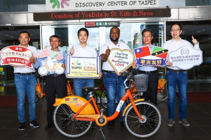 9日上午,臺北市長蔣萬安致贈50臺YouBike 1.0自行車給友邦聖克里斯多福及尼維斯(後簡稱克國),由克國駐臺大使范東亞(Amb. Donya Francis)代表受贈。這些在2022年底退場的自行車,將跨海到克國延續服務。