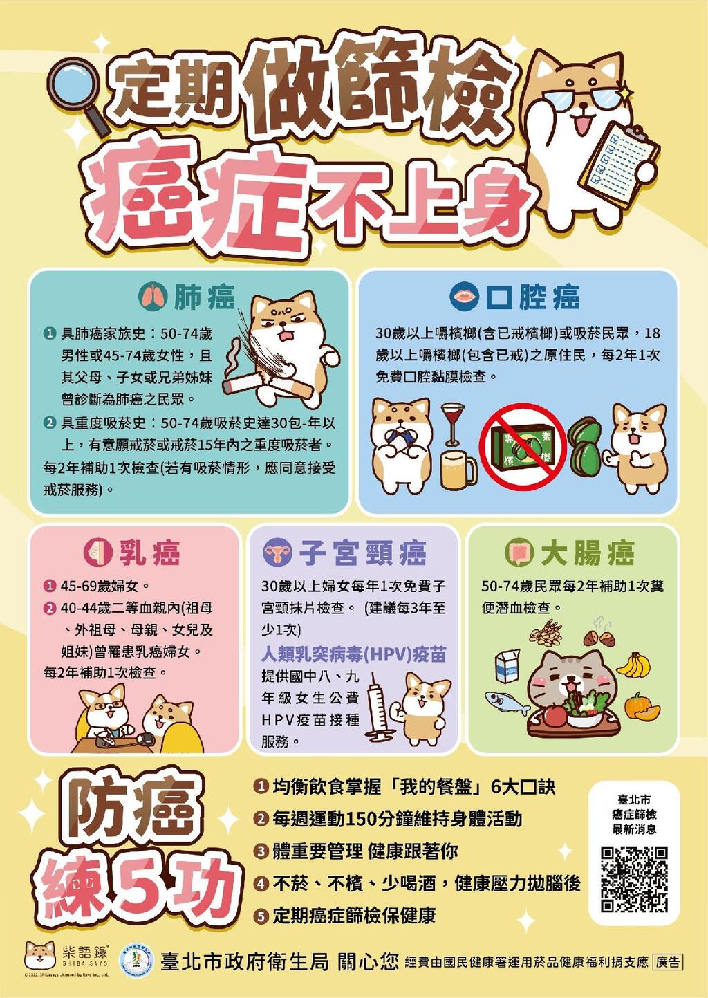 臺北市有1,082家醫療機構散布於12行政區,篩檢資源豐沛可提供市民5項(肺癌、大腸癌、乳癌、子宮頸癌、口腔癌)公費癌症篩檢;此外,為提升社區健康檢查可近性,衛生局112年規劃130場社區整合式預防保健服務,提供一站式成人健檢與5項癌症篩檢服務,並預計於7-8月結合臺北市219家診所與醫院共同舉辦篩檢獎勵活動,街頭巷尾都是市民癌症篩檢的好夥伴。