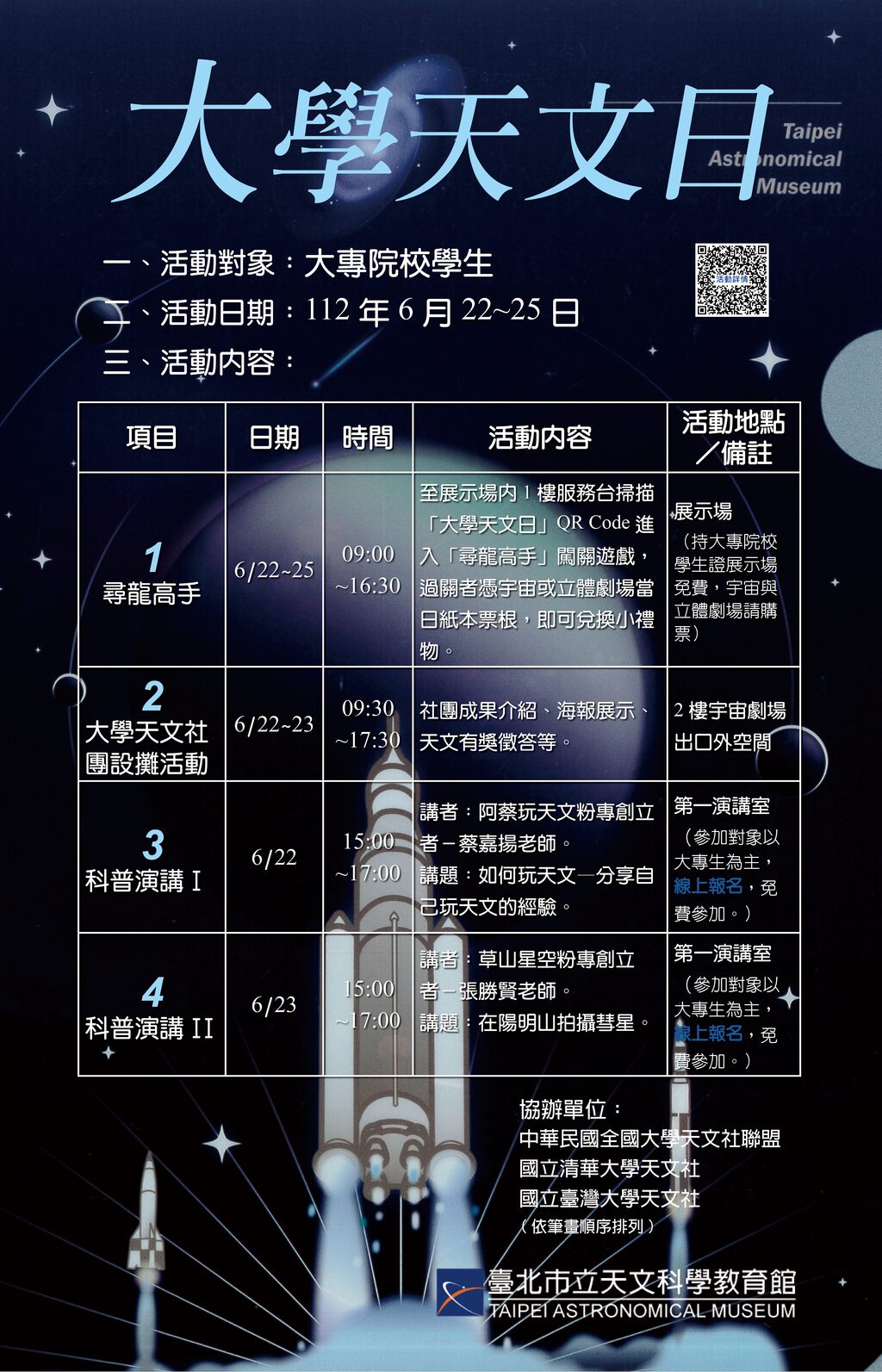 端午連假6月22日(四)至25日(日)臺北天文館舉辦「大學天文日」系列活動,活動期間全國大專院校學生(含研究生)憑學生證即可免費參觀展示場!