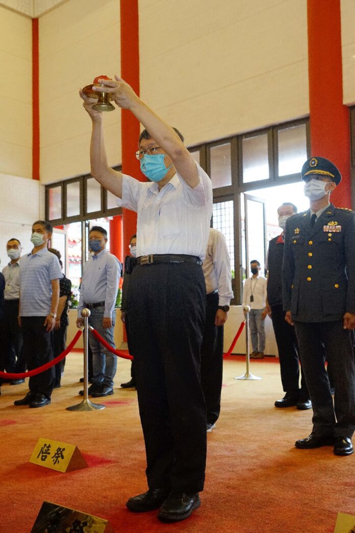 祭典一開始,柯文哲就主祭者位後率各局處、區公所及軍方代表,向國軍陣(公)亡將士暨烈士靈位,進行上香、獻花、獻果以及三鞠躬禮,場面莊嚴隆重。典禮結束後,柯文哲也一一向遺族代表握手致意並致贈慰問金,以表達市府的追思和緬懷之意。