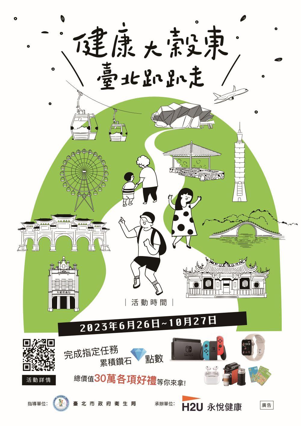 根據統計顯示,近10年臺北市僅有近四成的市民有規律運動習慣! 隨著交通與科技便捷、後疫情生活及外送文化興起等,導致民眾生活更趨於靜態。為培養市民健康動態生活,臺北市政府衛生局自6月26日起至10月27日推出為期4個月的「2023健康大榖東,臺北趴趴走」系列健走活動,從問答挑戰賽的知能提升到結合智慧載具起身健走四大關卡,邀請在臺北市工作、就學及生活之民眾健康起步走,養成規律身體活動,還有總價值超過30萬元的好禮等您來挑戰!