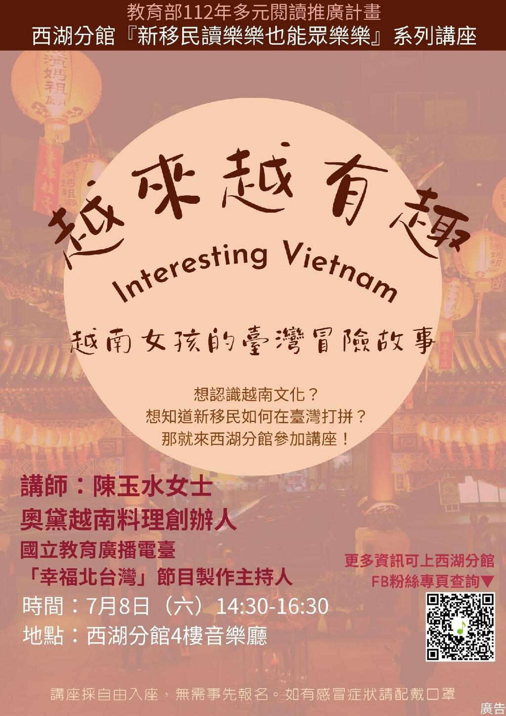 西湖分館的新移民閱讀活動,包括主題講座、手作工作坊,以及兒童說故事活動。講座主題「越來越有趣—越南女孩的臺灣冒險故事」於7/8(週六)下午2時30分,在西湖分館四樓音樂廳舉辦。工作坊則以多元文化為主題,7/16(週日)起陸續開課,邀請民眾一邊動手做、一邊體驗異國魅力。
