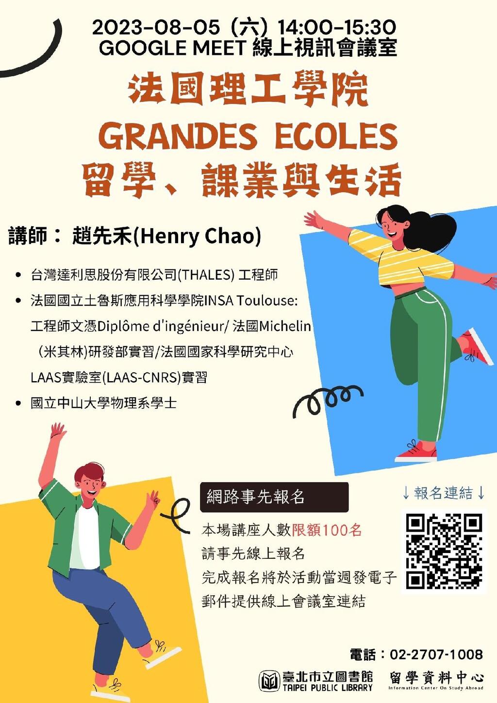 臺北市立圖書館留學資料中心於8月5日(六)14時邀請畢業於法國國立土魯斯應用科學學院,獲取工程師文憑(Diplôme d’ingénieur)的趙先禾(Henry Chao)講師,講述法國理工高等學院Grandes Ecoles 體系介紹與申請流程、條件、語言學習及獎學金資訊,分享法國理工高等學院入學條件、高等學院學制(學期及課程內容)、法國在地實習經驗,最後提及法國留學生活包括住宿、語言、飲食、交通和旅遊等人生經驗甘苦談。歡迎計劃前往法國留學的學生與一般民眾連線參與!