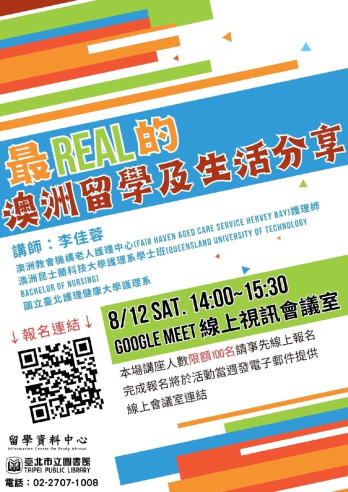臺北市立圖書館留學資料中心於8月12日(六)14時邀請畢業於澳洲昆士蘭科技大學護理系學士班的李佳蓉講師,分享留學期間個人學習經驗、語言能力培養、澳洲當地生活花費、交通與休閒活動,畢業後面臨求職、醫療保險、薪資與稅收、歧視問題及國外生活優點與缺點。歡迎計劃前往澳洲留學的學生與一般民眾連線參與!