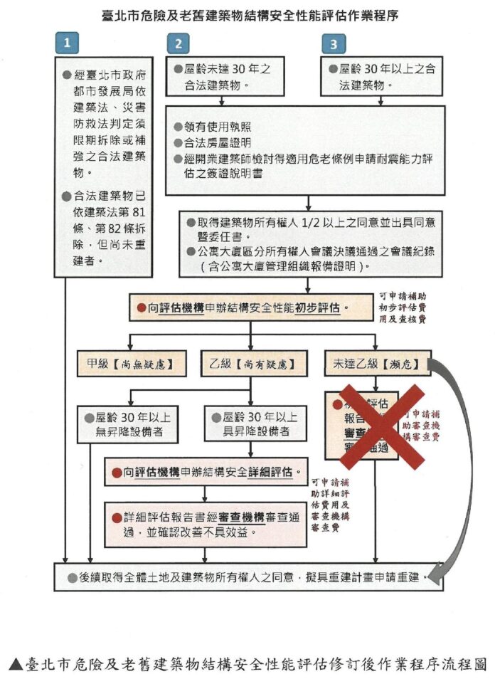 建管處虞積學處長進一步表示,考量老舊建築物防災、抗震能力亟待提昇,北市府已會同民間專業團體及專業人員成立「危老重建輔導團」、「危老重建工作站」及培訓「危老重建推動師」等輔導措施,輔導民眾申請危老重建事宜,解決民眾對於危老重建之疑義,目前全市已設置116處「危老重建工作站」,並安排「危老重建推動師」進駐,為市民提供免費的在地化諮詢服務,歡迎民眾可至本處網站「危老重建專區」查閱就近之工作站或績優推動師洽詢;另達3戶建物所有權人同意可向北市府所委託之廠商(臺北市建築師公會)申請駐點說明或達10戶同意可申請辦理說明會,希冀市民疑義得以順利解決,盡速達成更新重建之目的,達到「安全、便利、人性化」的居住環境。